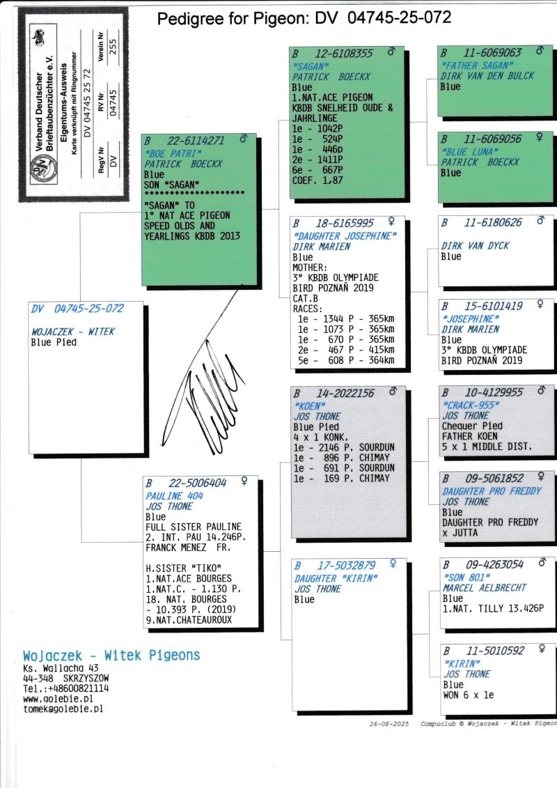 KOSZT TRANSPORTU 120 ZŁ (maksymalnie 3 gołębie w jednej paczce). KOSZTA ZA GOŁĘBIA I TRANSPORT KLIENCI BĘDĄ PŁACIĆ BEZPOŚREDNIO KIEROWCY KTÓRY PRZYWIEZIE GOŁĘBIE. Gołąb z hodowli WOJACZEK-WITEK. Szczegóły pochodzenia w rodowodzie. Kontakt w sprawie gołębi oraz transportu pod numerem telefonu +48 600 821 114