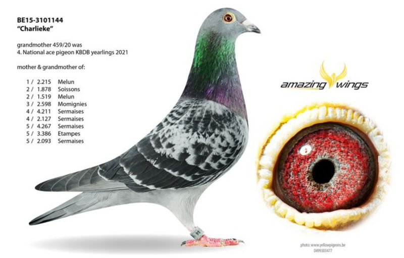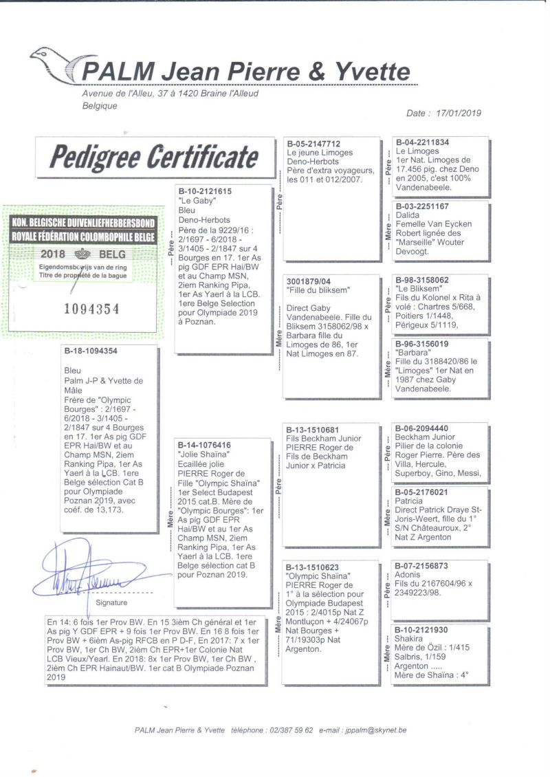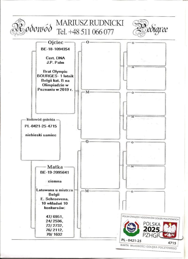Ojciec to pełny brat 1 gołębia Belgii OLYMPIC BOURGES, linia BLIKSEMA Vandenabeele. Matka lotowana z sukcesami u mistrza Belgii Eddy Schroevena, córka CHARLIEKE- jedna z najlepszych samic rozpłodowych Schroevena. Szczegóły pochodzenia w rodowodzie i pod nr tel. 696 241 555