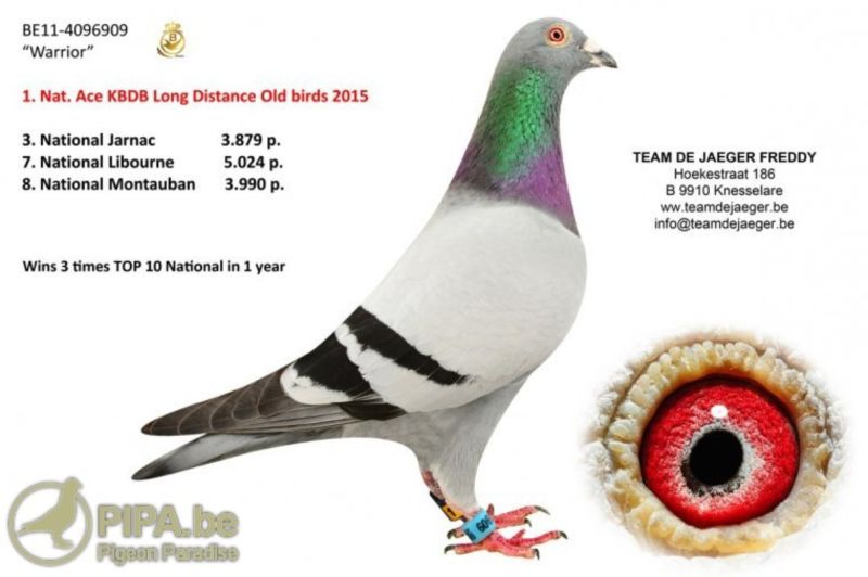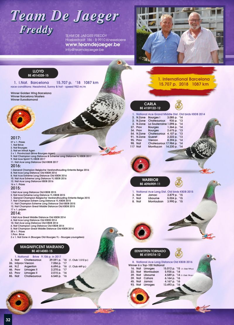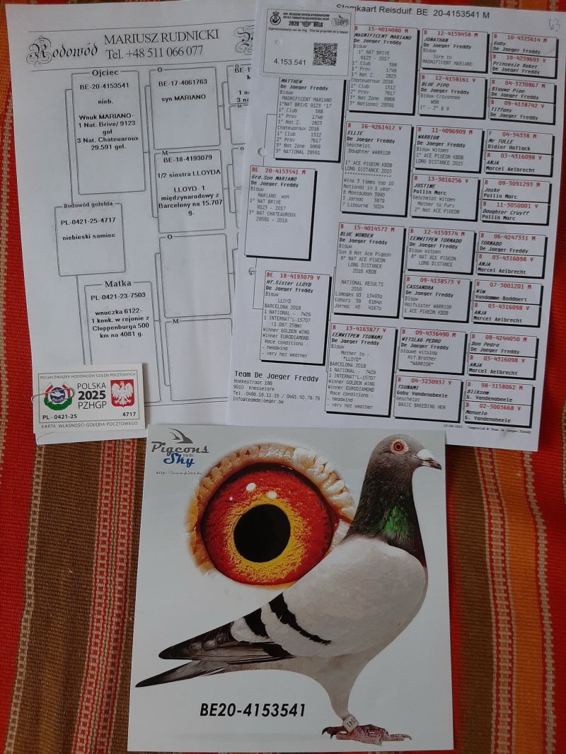 Ojciec to wnuk MARIANO i prawnuk WARRIORA. MARIANO- 1 narodowy z Brive na 9.123 goł. i 3 narodowy konkurs z Chateauroux na 29.591 goł. WARRIOR- 1 as Belgii dalekiego dystansu w 2015 roku. Babka jest przyrodnią siostrą LLOYDA. Gołąb z dalekodystansowej hodowli Freddy De Jaegera, hodowcy słynnego LLOYDA, który wygrał międzynarodową Barcelonę w 2018 roku i został zakupiony przez Batenbug v/d Merwe za 264 tys. euro. Matka młodego linia Van Dycka 6122, który wygrał lot w rejonie z Cloppenburga 500 km. Szczegóły pochodzenia w rodowodzie i pod nr tel. 696 241 555