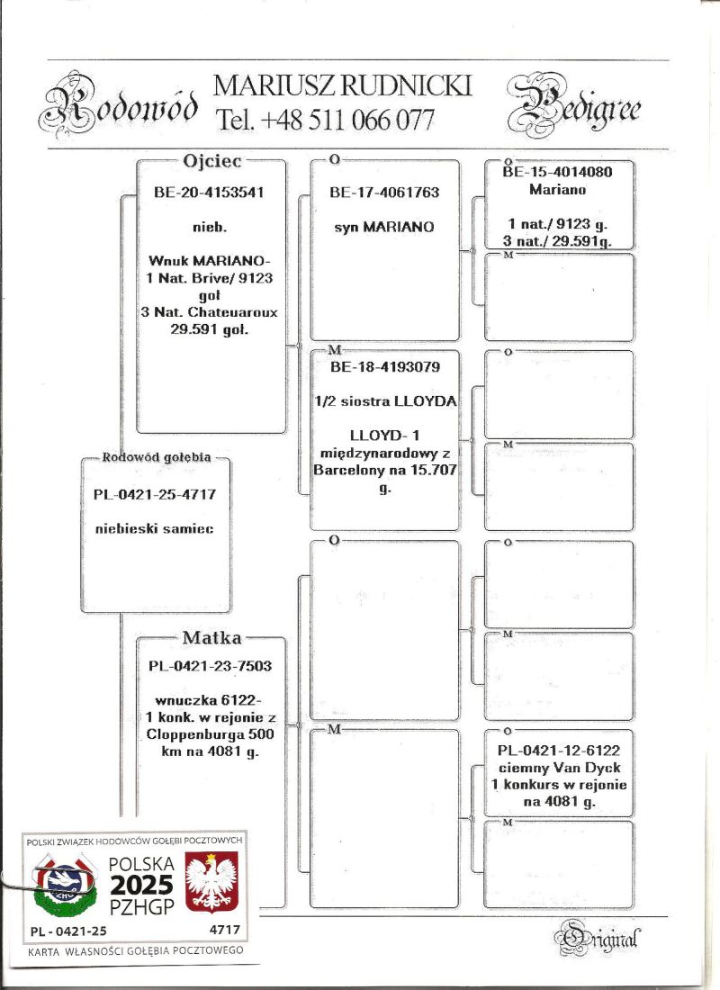 PL-0421-25-4717 - Ojciec wnuk MARIANO. Linia LLOYDA i WARRIOR. Oryg. FREDDY DE JAEGER. Gołębie dalekodystansowe