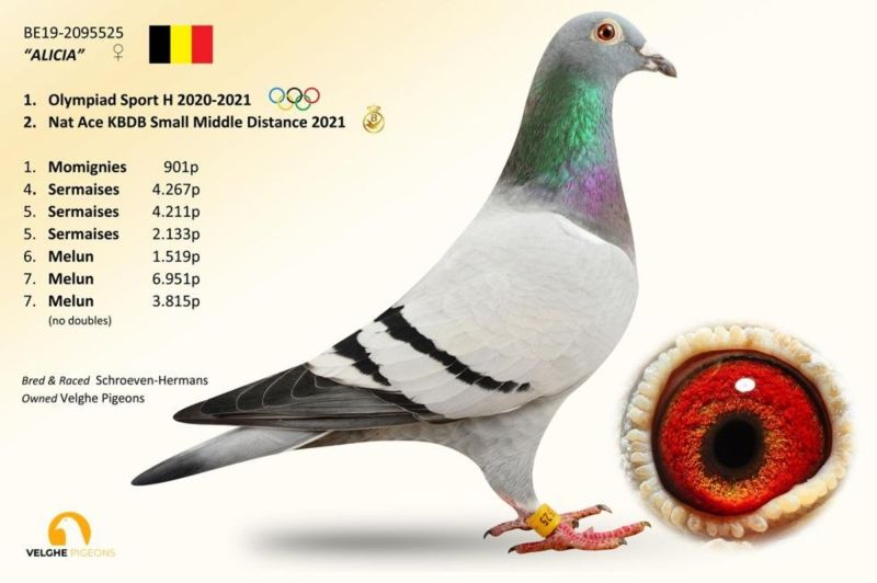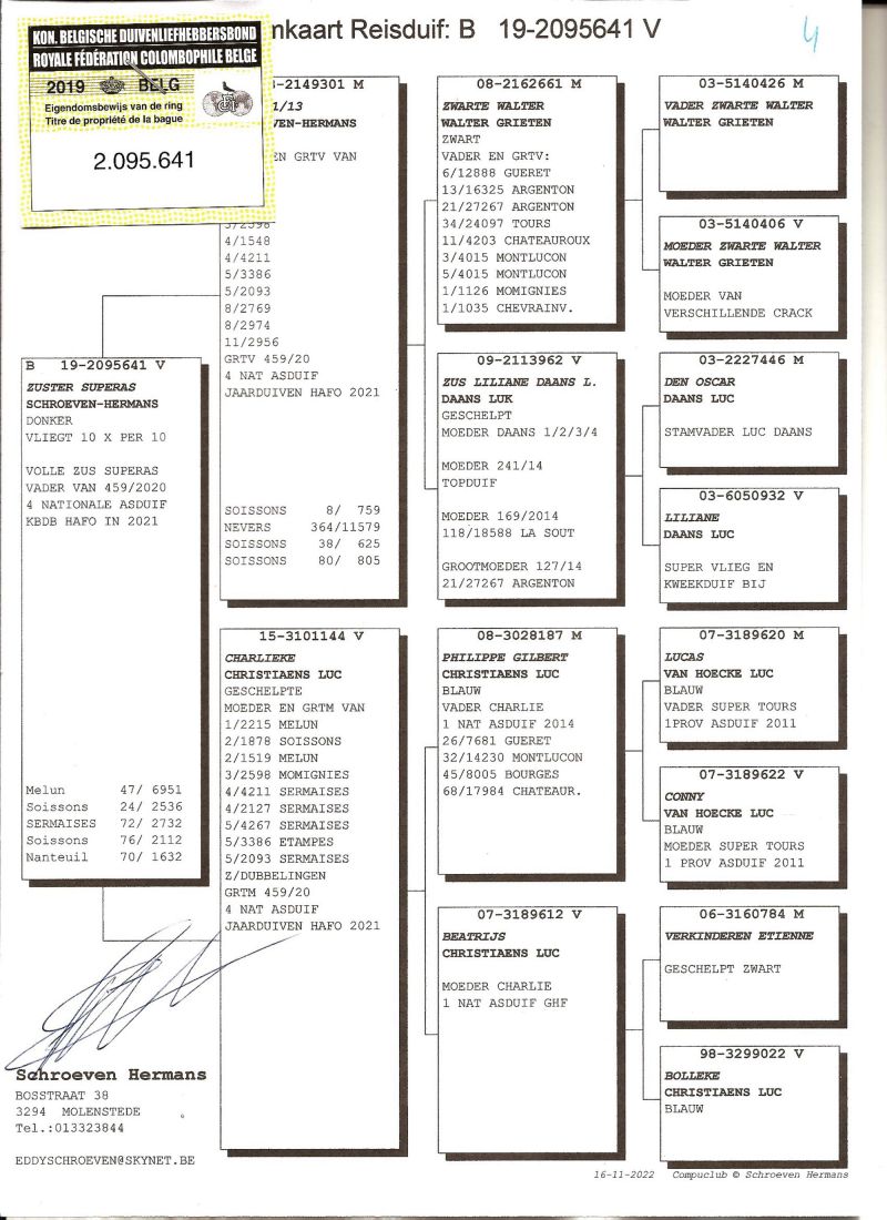 Ojciec ze starych gołębi De Laat od Tadeusza Zobla. Matka lotowana z sukcesami u mistrza Belgii Eddy Schroevena, córka CHARLIEKE- jedna z najlepszych samic rozpłodowych Schroevena. Szczegóły pochodzenia w rodowodzie i pod nr tel. 696 241 555