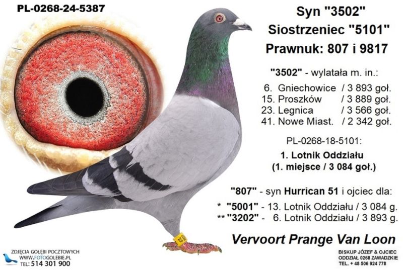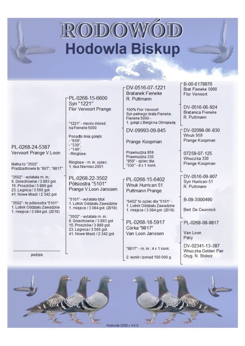 Matka to "3502"; Pradziadkowie to "807", "9817"; "3502" - wylatała m. in.: 6. Gniechowice / 3 893 goł., 15. Proszków / 3 889 goł., 23. Legnica / 3 566 goł., 41. Nowe Miast. / 2 342 goł.; "3502" - to półsiostra "5101": 1. Lotnik Oddziału Zawadzkie, 1. miejsce / 3 084 goł. (2018); /// Koszt wysyłki 150 zł ///