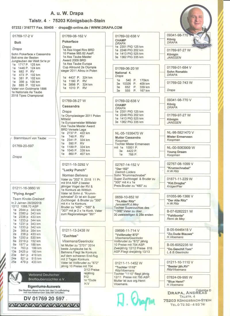 Oryginalny gołąb z hodowli Dariusz Janas . Szczegóły pochodzenia w rodowodzie . Więcej informacji pod nr. tel . 502581334 ......... koszt transportu do 3 szt. 120 zł. 150zł. w zależności od kuriera.
