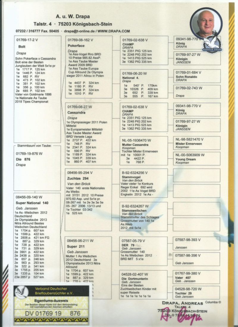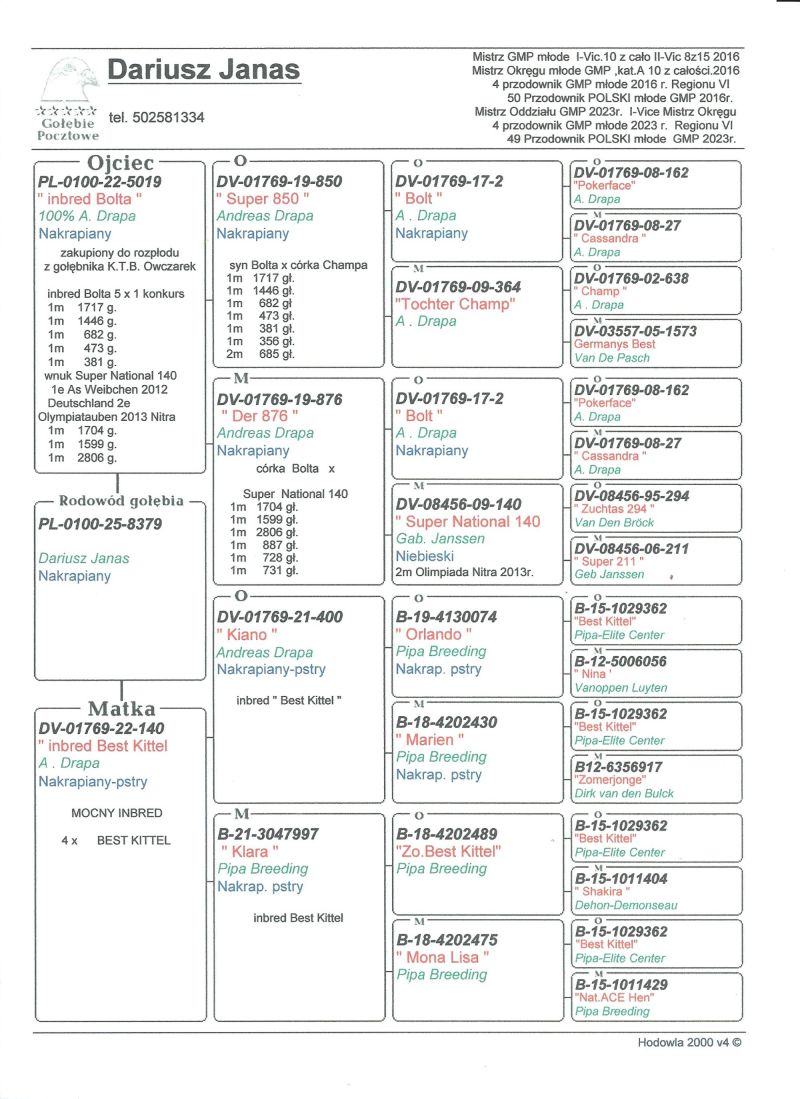 Oryginalny gołąb z hodowli Dariusz Janas . Szczegóły pochodzenia w rodowodzie . Więcej informacji pod nr. tel . 502581334 ......... koszt transportu do 3 szt. 120 zł. 150zł. w zależności od kuriera.