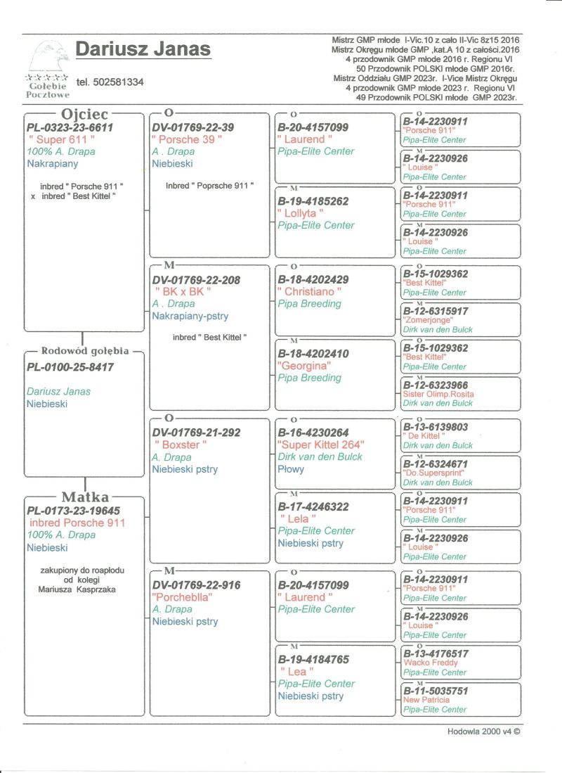 Oryginalny gołąb z hodowli Dariusz Janas . Szczegóły pochodzenia w rodowodzie . Więcej informacji pod nr. tel . 502581334 ......... koszt transportu do 3 szt. 120 zł. 150zł. w zależności od kuriera.