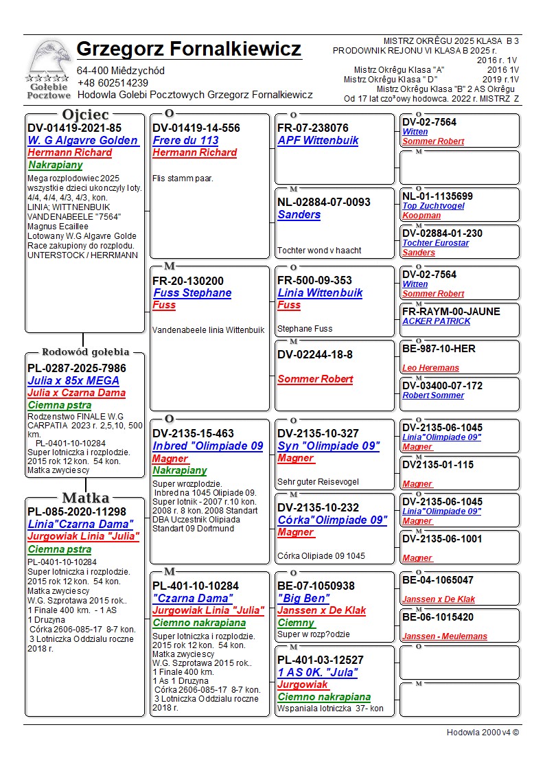 AUKCJA PROMOCYJNA (Cena obowiązuje wyłącznie na tej aukcji) Profesjonalna hodowla z wieloletnim doświadczeniem, posiadająca w swoim stadzie materiał najwyższej światowej klasy. Super budowa i pochodzenie więcej w rodowodzie. Z TEJ LINII WYWODZĄ SIĘ ZWYCIĘZCY WG, ODDZIAŁU I OKRĘGU. "RODZICE LOTOWANI NA WG ALGAVRE"