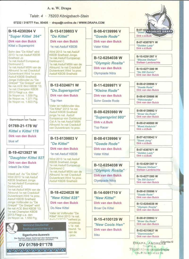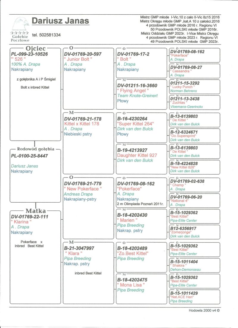 Oryginalny gołąb z hodowli Dariusz Janas . Szczegóły pochodzenia w rodowodzie . Więcej informacji pod nr. tel . 502581334 ......... koszt transportu do 3 szt. 120 zł. 150zł. w zależności od kuriera.
