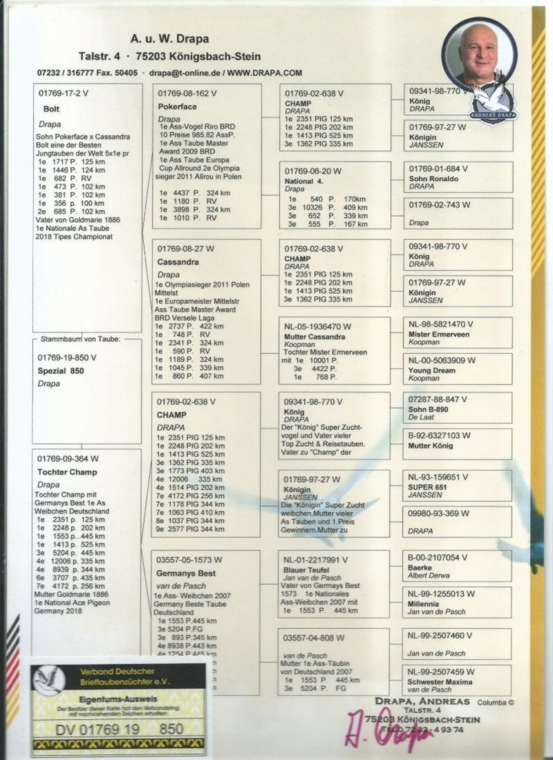 Oryginalny gołąb z hodowli Dariusz Janas . Szczegóły pochodzenia w rodowodzie . Więcej informacji pod nr. tel . 502581334 ......... koszt transportu do 3 szt. 120 zł. 150zł. w zależności od kuriera.