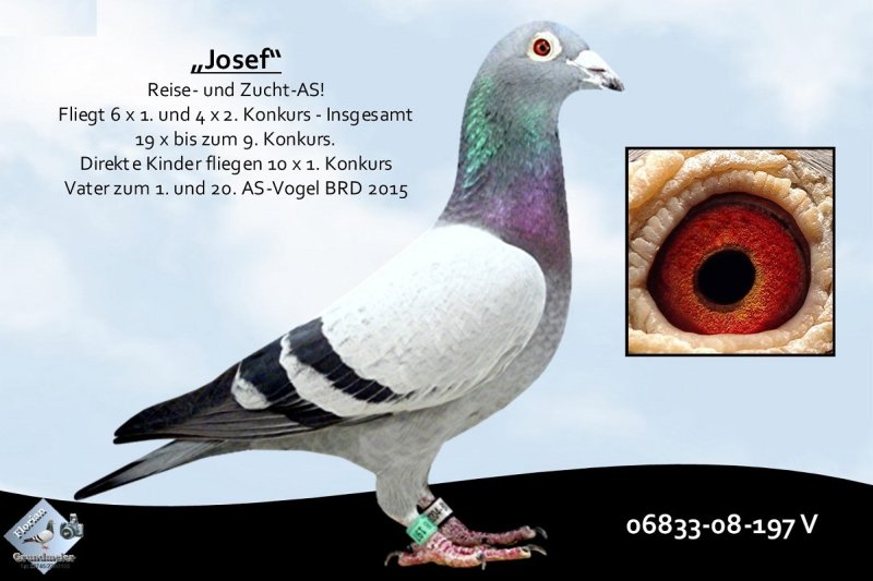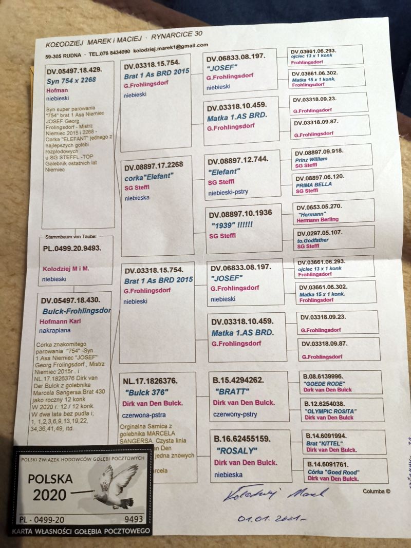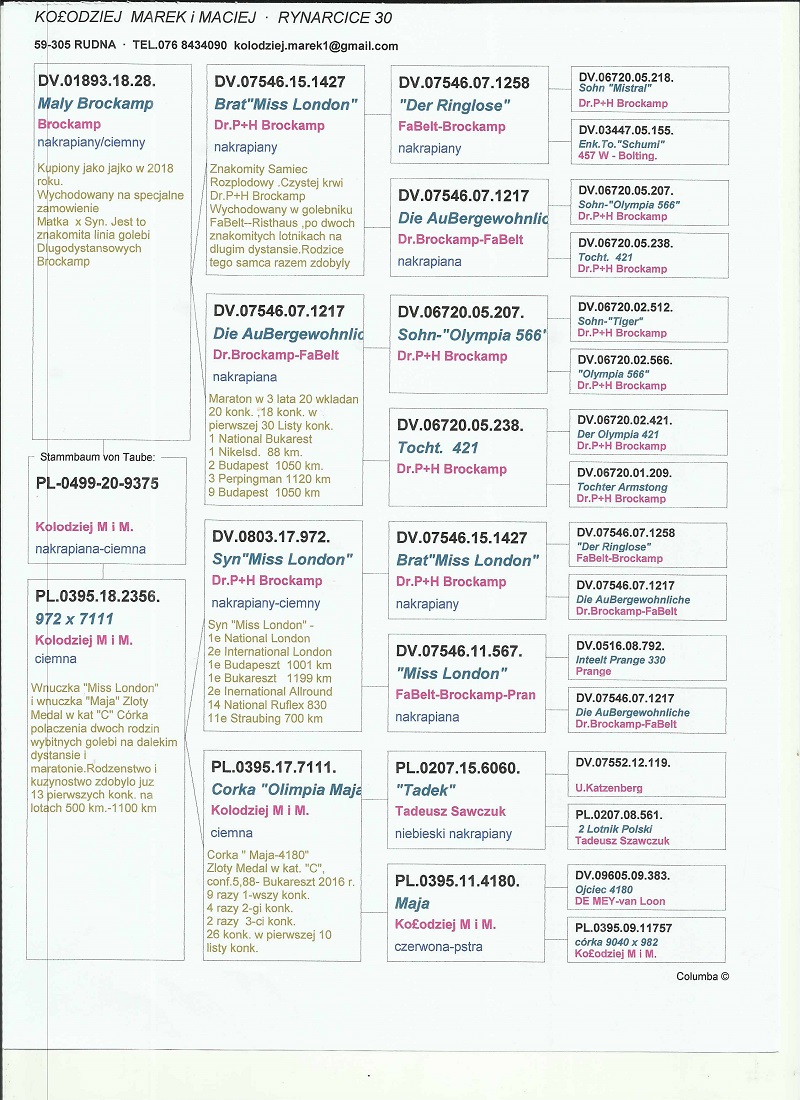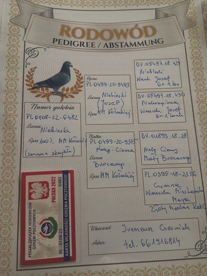 Oryginalny gołab z hodowli Ireneusza Czerniaka. Po dwóch oryginalnych gołębiach M.M. Kołodziej. Wycofana z racji na uszkodzone skrzydło, normalnie funkcjonuje!