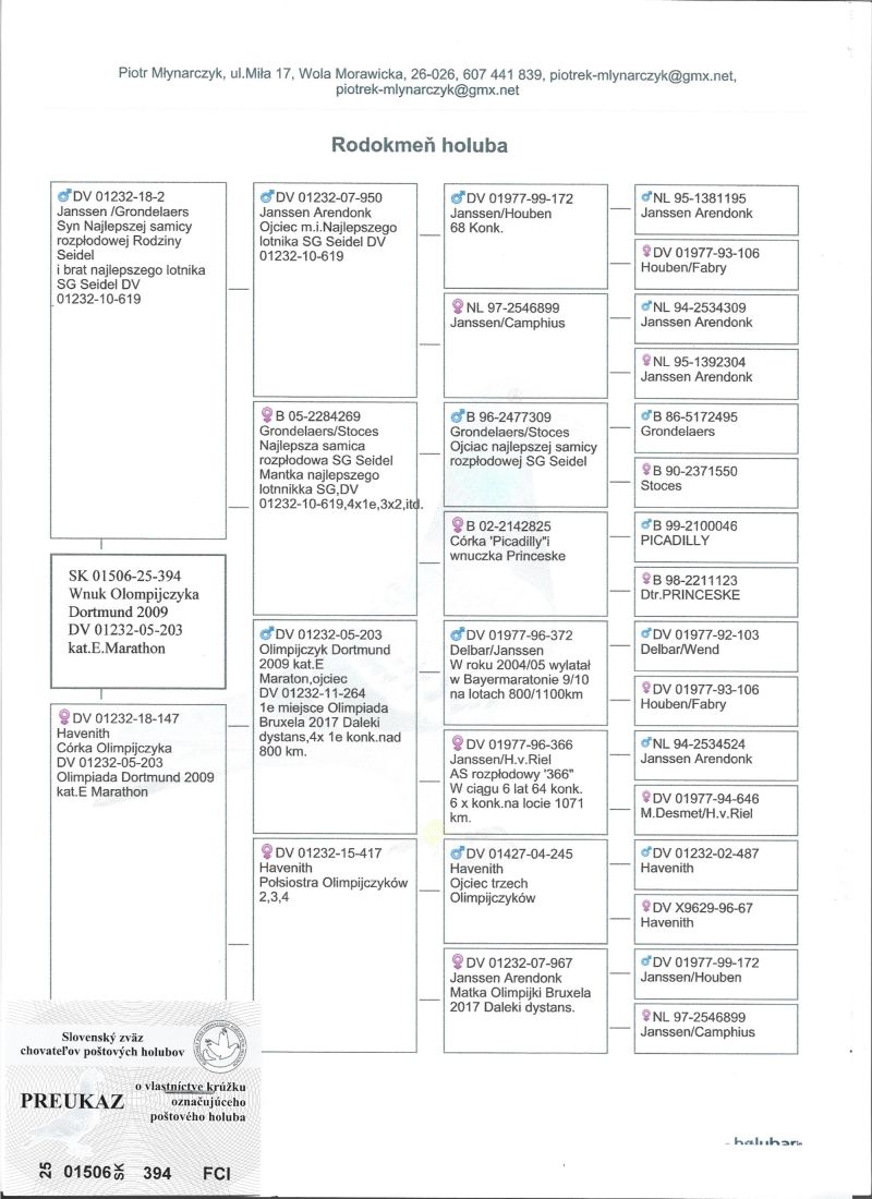 Havenith ,gołąb dalekodystansowy.Wnuk (wnuczka) najlepszej samicy rozpłodowej SG Seidel BE 05-2284269 i Olimpijczyka Dortmund 2009 kat.E Maraton DV 01232-05-205.Rodzina Seidel posiada siedmiu Olimpijczyków w kategorii daleki dystans, m.in. DV 01232-15-306 Olimpijka z Oradea 2022, pierwszy gołąb niemiec i 17 świata. Gołąbki zaszczepione msv i odrobaczone. Transport gołębi kurierem po wcześniejszym uzgodnieniu,odbiór osobisty .