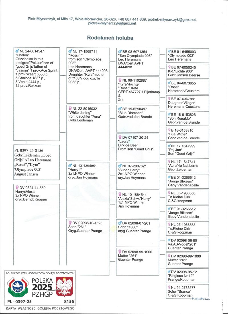 Ojciec gołębia to "Chalon" prawnuk "Olimpiade 003"Leo Hereman i Prawnuk"Pej Jun" son "Goed Grijs"gebr.Leideman,matka gołębia to wnuczka "Super Harry" Jan Hoymans i wnuczka "261"Guenter Prange.Gołąb zaszczepiony MSV i odrobaczony.Transport kurierem po wcześniejszym uzgodnieniu,odbiór osobisty.