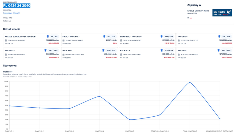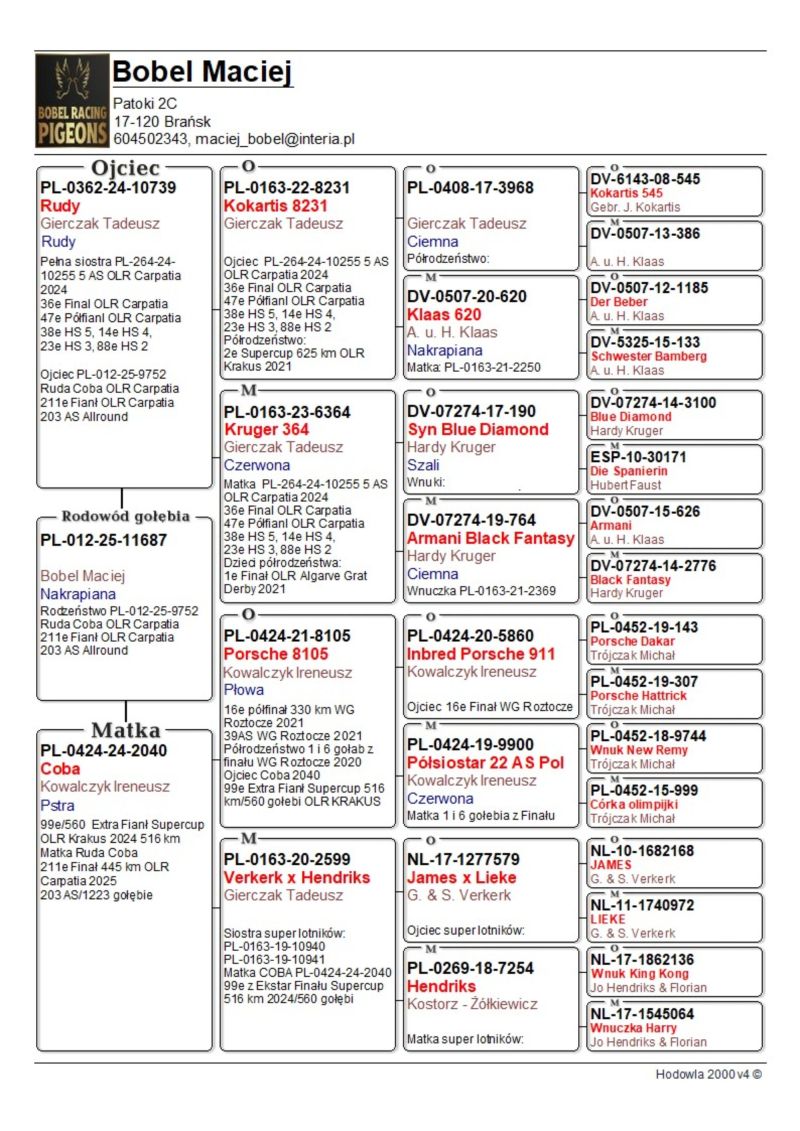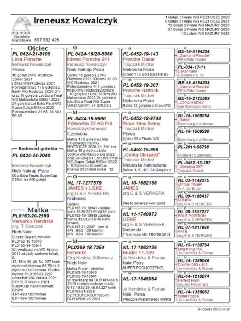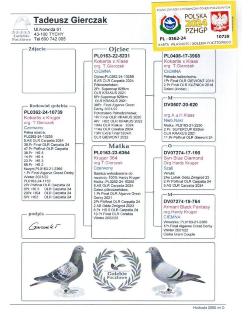 Na aukcji młody pięknie zbudowany samczyk wychowany w celi indywidualnej z połączenia dwóch wybitnych gołębi z predyspozycjami pod WG. Ojciec to gołąb od kolegi Tadeusza Gierczaka z jego najlepszej linii pod WG czyli Kokartis, Klass i Kruger, zaś matka jest po całym programie lotowym na WG Krakus z hodowli Ireneusza Kowalczyka z linii Porsche. Szczegóły w rodowodzie. Preferowany odbiór osobisty woj. podlaskie, ewentualnie dostawa kurierem po ustaleniu szczegółów.