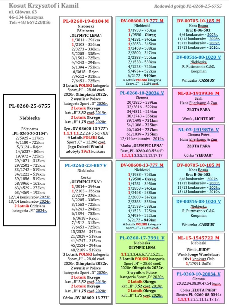PL-0260-25-6755 – Inbred Syn x Córka „777” – 1,1,1,1,1 konkurs 4 Lotnik Polski oryg. Kosut K. & K. 85x1 konkurs Oddziału