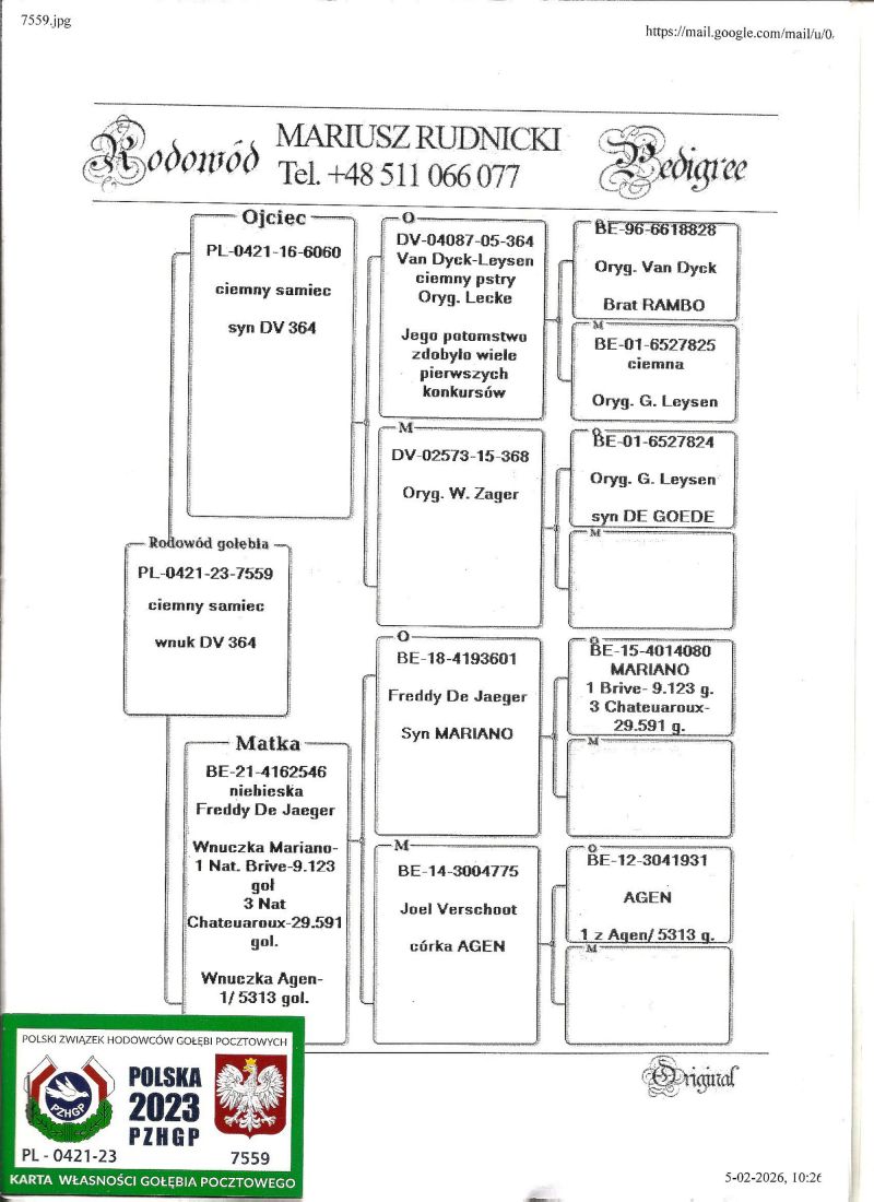 PL-0421-23-7559 - Wnuk DV 364- Super rozpłodowca Van Dyck/ Leysen. Linia RAMBO, AGEN, MARIANO