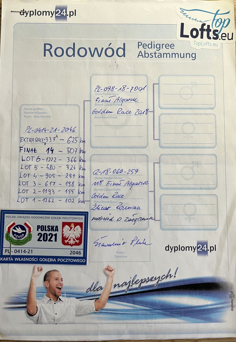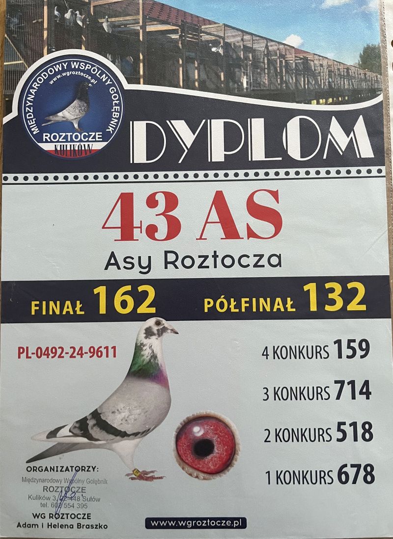 TOP POD WG - uczestnik WG KRAKUS 14 miejsce FINAŁ 507km Oryginalny gołąb z hodowli Sławomir Pluta. szczegóły pochodzenia w rodowodzie. Więcej informacji pod nr tel.: 530131812 - z powodu wykonywanej pracy najlepiej SMS *Wysyłka kurierem ok. 150zł.