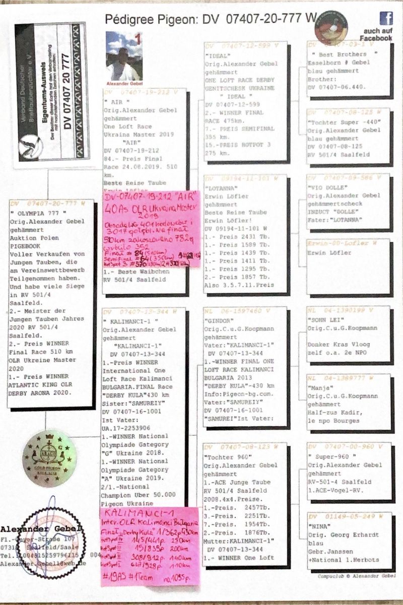 TOP POD WG Oryginalny gołąb z hodowli Alexander Gebel. Szczegóły pochodzenia w rodowodzie. Więcej informacji pod nr tel.: 530131812 - z powodu wykonywanej pracy najlepiej SMS *Wysyłka kurierem ok. 150zł.
