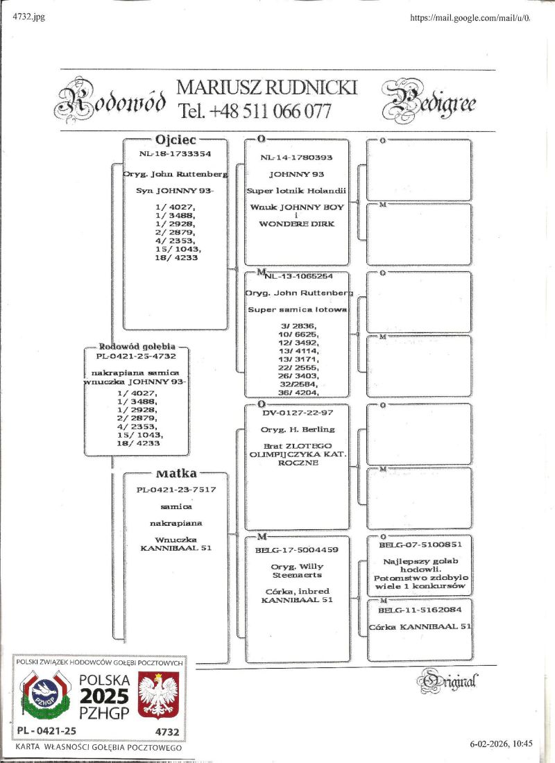 PL-0421-25-4732 - Syn JOHNNY 93 - czołowy lotnik Holandii 3x1 konkurs x wnuczka KANNIBAAL 51