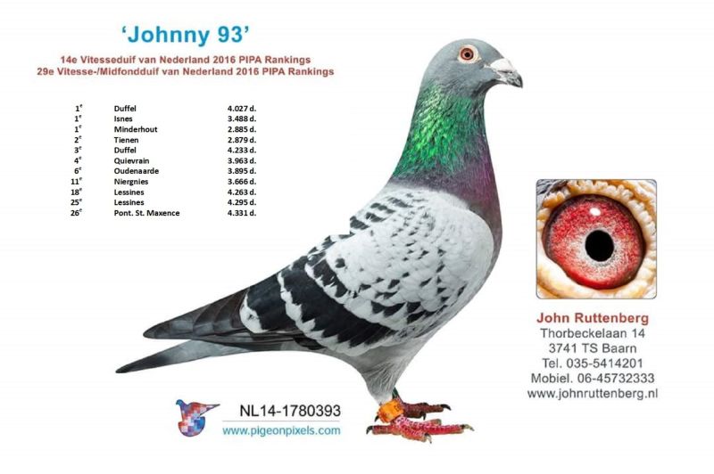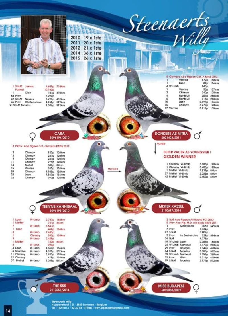 Ojciec to syn super lotnika Johnny 93. Matka wnuczka Kannibaal 51 najlepszego gołębia hodowli Willy Steenaertsa. Szczegóły pochodzenia w rodowodzie i pod nr tel. 696 241 555