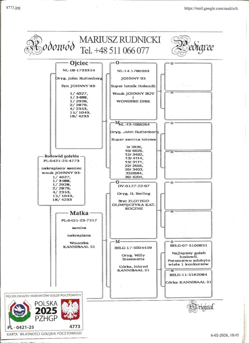 PL-0421-25-4773 - Syn JOHNNY 93 - czołowy lotnik Holandii 3x1 konkurs x wnuczka KANNIBAAL 51
