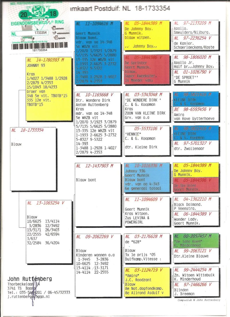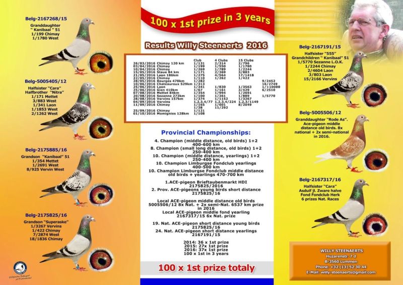 Ojciec to syn super lotnika Johnny 93. Matka wnuczka Kannibaal 51 najlepszego gołębia hodowli Willy Steenaertsa. Szczegóły pochodzenia w rodowodzie i pod nr tel. 696 241 555