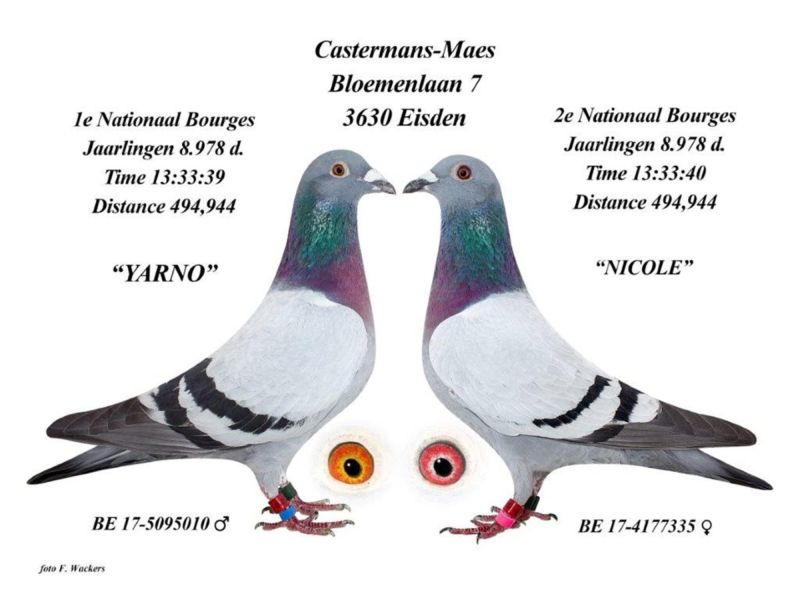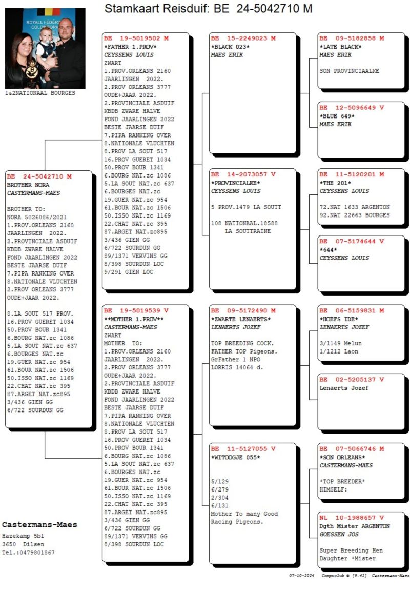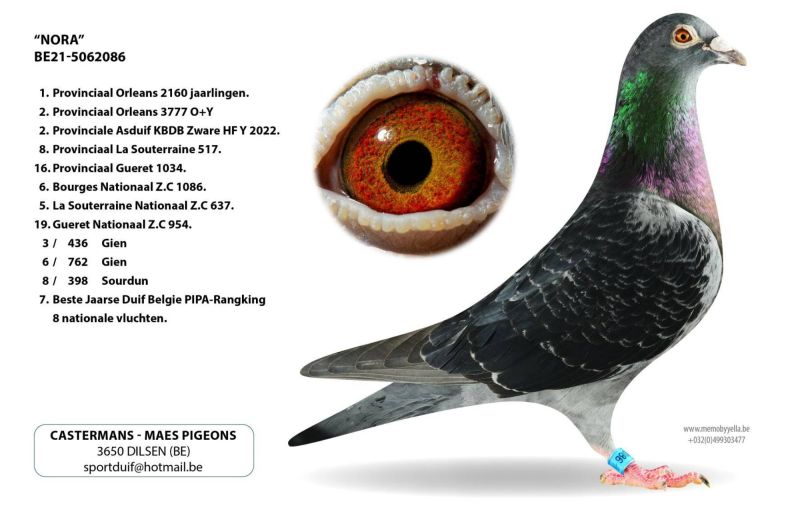 Brat NORY- 7 roczny Belgii w rankingu PIPA. Gołąb z belgijskiej hodowli z super wynikami. Nie jest to hodowla komercyjna. Jej wysoki poziom potwierdzają wyniki. 1 konkursy w lotach prowincjonalnych, narodowych, czołowe lotniki w rankingu PIPY. Np. 1 i 2 konkurs z lotu narodowego z Bourges (500 km) na 8.978 gołębi rocznych na całą Belgię. Szczegóły pochodzenia w rodowodzie i pod nr tel. 696 241 555