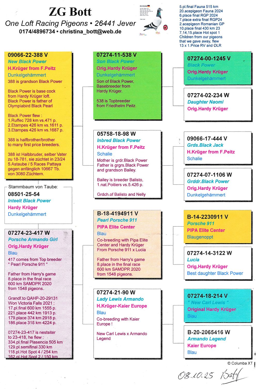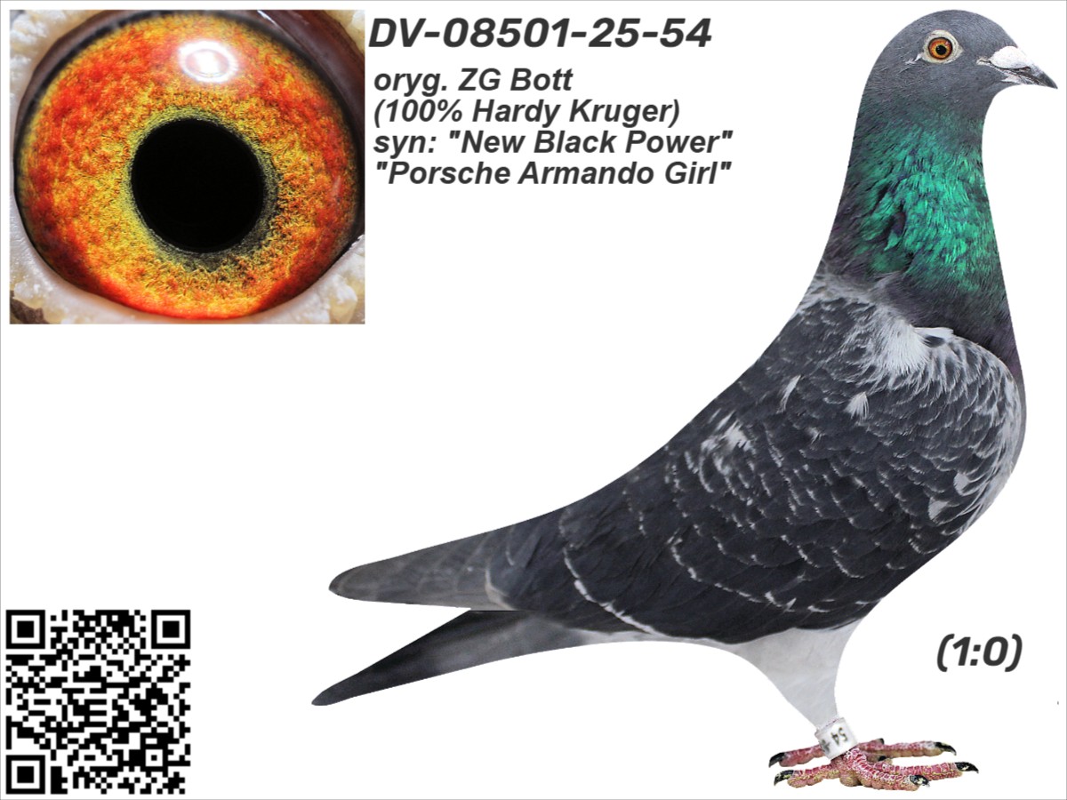 oryg. ZG Bott (100% Hardy Kruger), syn: "New Black Power", "Porsche Armando Girl" Szczegóły pochodzenia w rodowodzie. Gołąb jest sprzedawany bezpośrednio od hodowcy i znajduje się w Polsce, można go obejrzeć w miejscowości Zblewo (woj. pomorskie), po wcześniejszym kontakcie telefonicznym. Więcej informacji o gołębiu i transporcie pod nr tel.: 511 607 710.