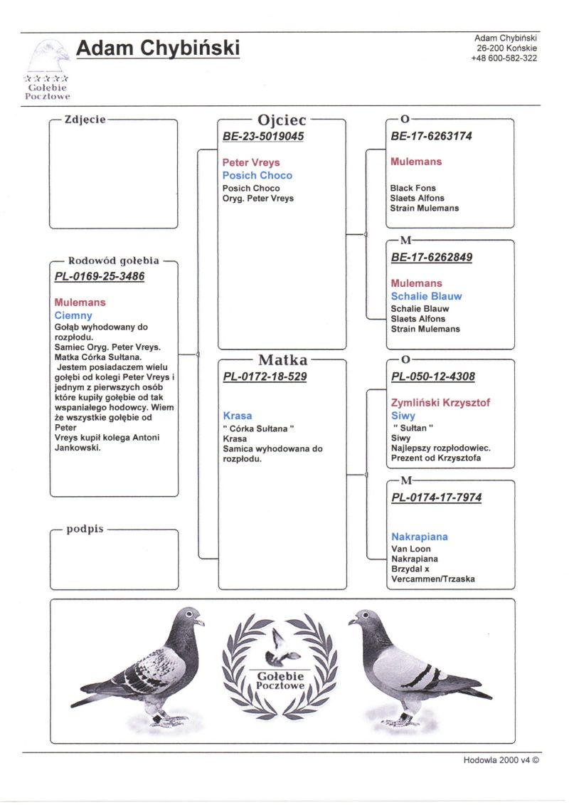Witam. Do sprzedania są młode gołębie z hodowli Chybiński Adam i Tomasz. Gołębie wystawione na aukcji wywodzą sie z gołębi rozpłodowych sprowadzonych z wielu hodowli za granicą jak i od polskich hodowców. Wszystkie młode gołębie pochodzą z rozpłodu. Posiadamy gołębie od: Peter Van De Merwe, Rafał Pasoń, Roland & Denis Faber, Peter Vreys, Piotr Madej, Michał Trójczak, Roland Kling, Wiesław Mikołajów, Frank & Andy Kaden (gołębie na WG), Vermeerbergen - Wilms, Musik W&P, Bogumił Tokarczyk, Wiesław Owczarek, Dietmar Holtke (Hurrican 51, Fieneke 5000, Super Dohmen), Łyjak Marek & Andrzej, Adrian Kasprzak, Tomasz Trojan, Pałka M.T.M, Owczarek K.T.B, Bak Christian, Baesel Philipe, Hugo Vaasen, Alfred Strijker, John Stock, Jarosław Sznaucner, Jackowski Tomasz, Przemysław Wiktorowicz, Wiesław Młot, Kazimierz Druszcz, Gebraders Wolfs, Wiesław Piszczała i wiele innych. Zdjecia nie są profesjonalne ale gołębie są. Więcej informacji odnośnie gołębi pod numerem telefonu: Adam +48 600-582-322, Tomek +47 96873596 **koszty transportu ponosi kupujący