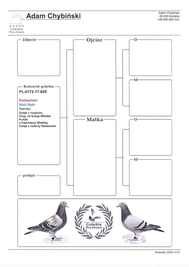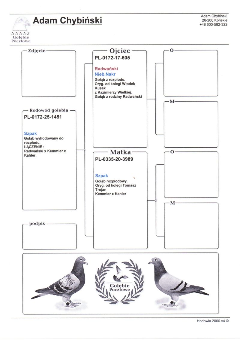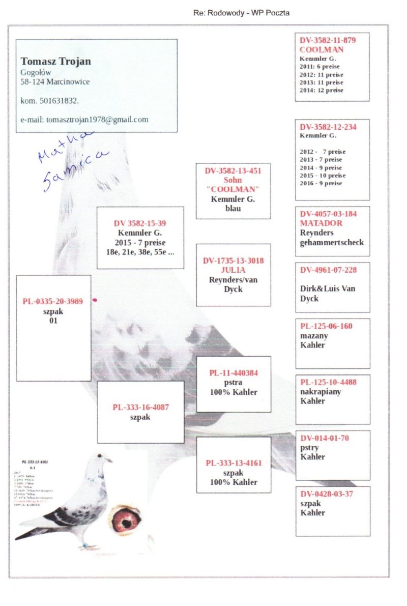 Witam. Do sprzedania są młode gołębie z hodowli Chybiński Adam i Tomasz. Gołębie wystawione na aukcji wywodzą sie z gołębi rozpłodowych sprowadzonych z wielu hodowli za granicą jak i od polskich hodowców. Wszystkie młode gołębie pochodzą z rozpłodu. Posiadamy gołębie od: Peter Van De Merwe, Rafał Pasoń, Roland & Denis Faber, Peter Vreys, Piotr Madej, Michał Trójczak, Roland Kling, Wiesław Mikołajów, Frank & Andy Kaden (gołębie na WG), Vermeerbergen - Wilms, Musik W&P, Bogumił Tokarczyk, Wiesław Owczarek, Dietmar Holtke (Hurrican 51, Fieneke 5000, Super Dohmen), Łyjak Marek & Andrzej, Adrian Kasprzak, Tomasz Trojan, Pałka M.T.M, Owczarek K.T.B, Bak Christian, Baesel Philipe, Hugo Vaasen, Alfred Strijker, John Stock, Jarosław Sznaucner, Jackowski Tomasz, Przemysław Wiktorowicz, Wiesław Młot, Kazimierz Druszcz, Gebraders Wolfs, Wiesław Piszczała i wiele innych. Zdjecia nie są profesjonalne ale gołębie są. Więcej informacji odnośnie gołębi pod numerem telefonu: Adam +48 600-582-322, Tomek +47 96873596 **koszty transportu ponosi kupujący