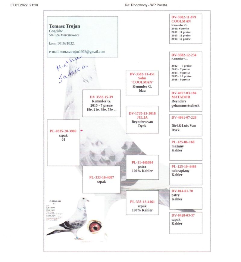 Witam. Do sprzedania są młode gołębie z hodowli Chybiński Adam i Tomasz. Gołębie wystawione na aukcji wywodzą sie z gołębi rozpłodowych sprowadzonych z wielu hodowli za granicą jak i od polskich hodowców. Wszystkie młode gołębie pochodzą z rozpłodu. Posiadamy gołębie od: Peter Van De Merwe, Rafał Pasoń, Roland & Denis Faber, Peter Vreys, Piotr Madej, Michał Trójczak, Roland Kling, Wiesław Mikołajów, Frank & Andy Kaden (gołębie na WG), Vermeerbergen - Wilms, Musik W&P, Bogumił Tokarczyk, Wiesław Owczarek, Dietmar Holtke (Hurrican 51, Fieneke 5000, Super Dohmen), Łyjak Marek & Andrzej, Adrian Kasprzak, Tomasz Trojan, Pałka M.T.M, Owczarek K.T.B, Bak Christian, Baesel Philipe, Hugo Vaasen, Alfred Strijker, John Stock, Jarosław Sznaucner, Jackowski Tomasz, Przemysław Wiktorowicz, Wiesław Młot, Kazimierz Druszcz, Gebraders Wolfs, Wiesław Piszczała i wiele innych. Zdjecia nie są profesjonalne ale gołębie są. Więcej informacji odnośnie gołębi pod numerem telefonu: Adam +48 600-582-322, Tomek +47 96873596 **koszty transportu ponosi kupujący