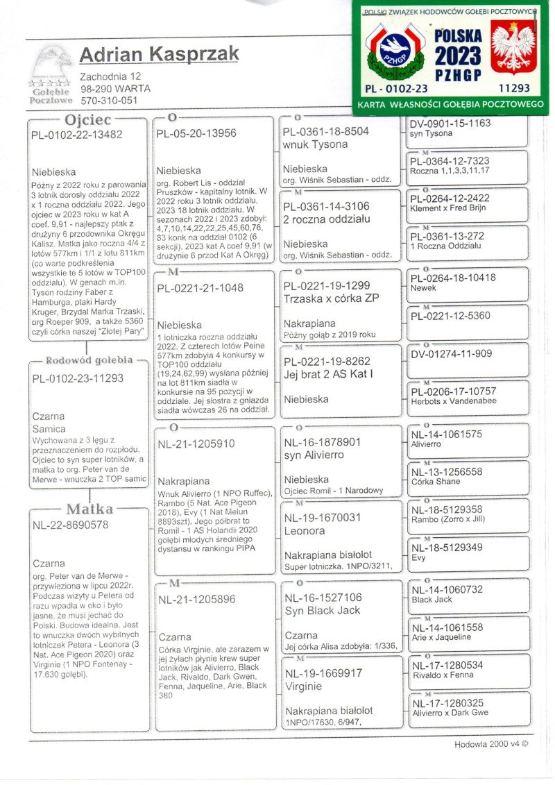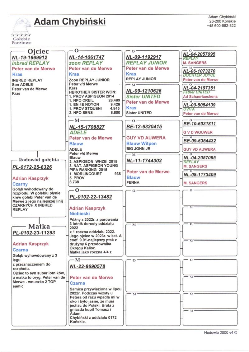 Witam. Do sprzedania są młode gołębie z hodowli Chybiński Adam i Tomasz. Gołębie wystawione na aukcji wywodzą sie z gołębi rozpłodowych sprowadzonych z wielu hodowli za granicą jak i od polskich hodowców. Wszystkie młode gołębie pochodzą z rozpłodu. Posiadamy gołębie od: Peter Van De Merwe, Rafał Pasoń, Roland & Denis Faber, Peter Vreys, Piotr Madej, Michał Trójczak, Roland Kling, Wiesław Mikołajów, Frank & Andy Kaden (gołębie na WG), Vermeerbergen - Wilms, Musik W&P, Bogumił Tokarczyk, Wiesław Owczarek, Dietmar Holtke (Hurrican 51, Fieneke 5000, Super Dohmen), Łyjak Marek & Andrzej, Adrian Kasprzak, Tomasz Trojan, Pałka M.T.M, Owczarek K.T.B, Bak Christian, Baesel Philipe, Hugo Vaasen, Alfred Strijker, John Stock, Jarosław Sznaucner, Jackowski Tomasz, Przemysław Wiktorowicz, Wiesław Młot, Kazimierz Druszcz, Gebraders Wolfs, Wiesław Piszczała i wiele innych. Zdjecia nie są profesjonalne ale gołębie są. Więcej informacji odnośnie gołębi pod numerem telefonu: Adam +48 600-582-322, Tomek +47 96873596 **koszty transportu ponosi kupujący