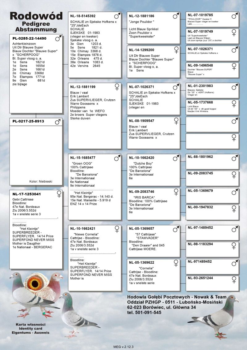 Super hodowla z wieloletnim doświadczeniem, posiadająca w swojej hodowli materiał najwyższej światowej klasy, wywodzący się od takich hodowców jak:PEC „Double Porsche 911”,Karol Paszek „808”, Ludo Claessens „Golden Supercrack” Verschot Joel „Armando” Andreas Drapa „Sky Fighter”-„Pokerface”, Kees Bosua „Figo”-„Olympic Irene”, Rik Custers ,Louis van Loon „Rominger-Silver Shadow”, Jan Hooymans „Harry”, Gerard Koopman, Gino Clicque, Jos Vercammen „Mustang”, Jelle Roziers, L,B.&J. Geerinckx, Peter v/d Merwe-Batenburg „New Laureeat”, Dirk van den Bulck „Kittel”, Arie Dijkstra, Leo Heremans „Olympiade 003” i „Bolt”, Pieter Veenstra „Olimpia”, Gebr. Cattijsse. Najwyższej klasy materiał hodowlany – najlepsze linie danych hodowców.