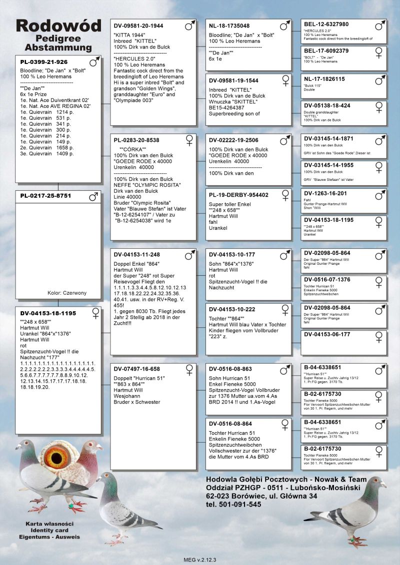 Oryginalny gołąb z hodowli Nowak & Team, szczegóły pochodzenia, rodowód poniżej.