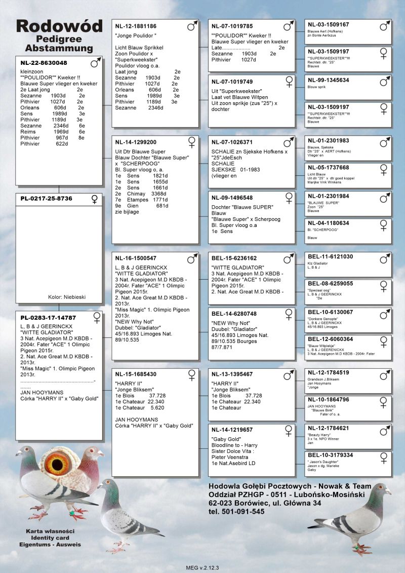 Oryginalny gołąb z hodowli Nowak & Team, szczegóły pochodzenia, rodowód poniżej.