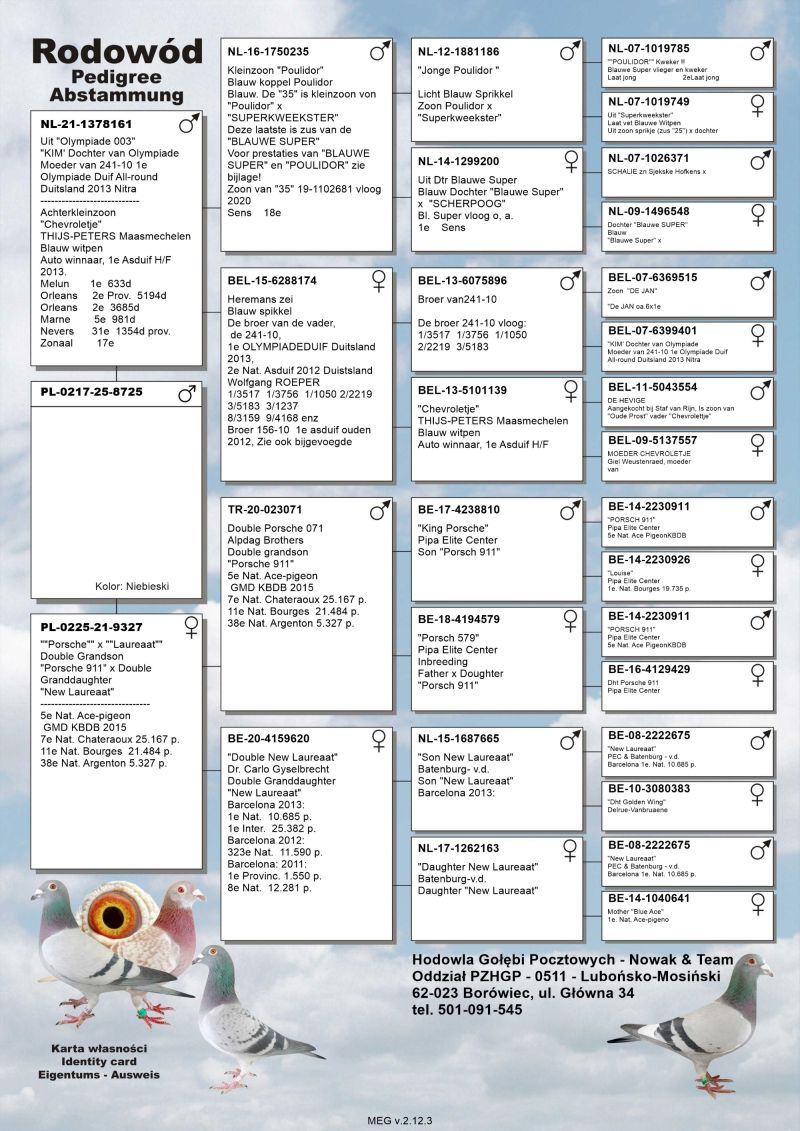 Oryginalny gołąb z hodowli Nowak & Team, szczegóły pochodzenia, rodowód poniżej.