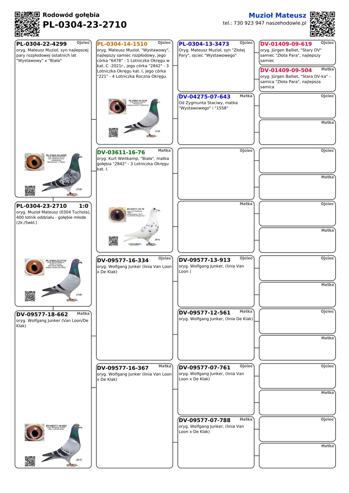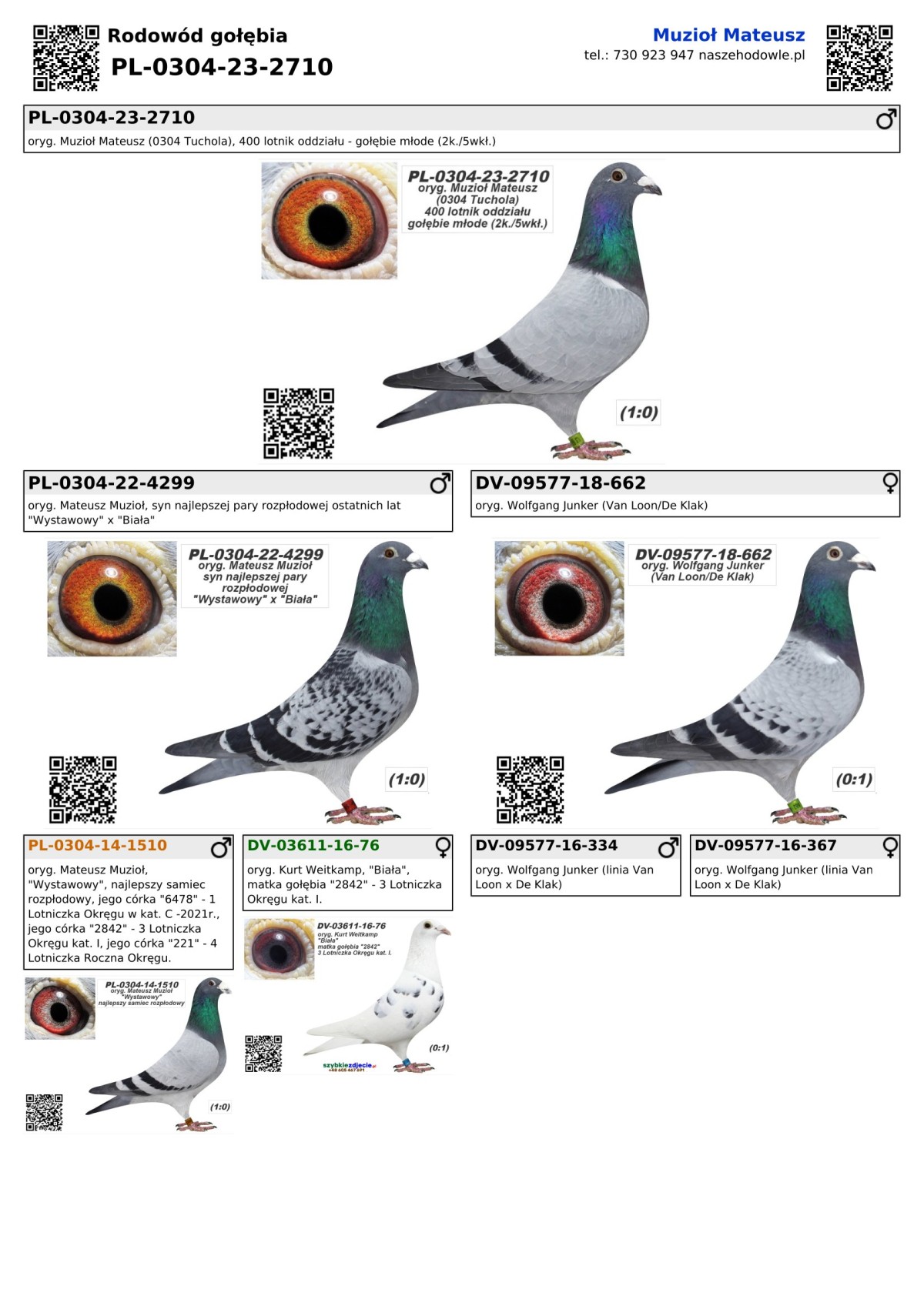 oryg. Muzioł Mateusz (0304 Tuchola), 400 lotnik oddziału - gołębie młode (2k./5wkł.) Szczegóły pochodzenia i wyniki lotowe w rodowodzie i załączonych materiałach. Gołębie były lotowane w oddziałach PZHGP. Więcej informacji o gołębiu pod nr tel.: 501 186 973. Uwaga!!! - zdjęcie gołębia było robione po zakończeniu sezonu lotowego - 2023.