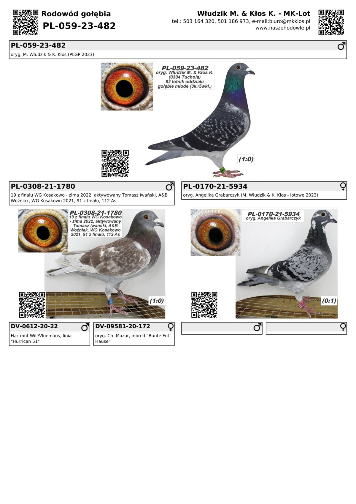 | Lot | Data | Dystans [km] | Ilość gołębi | Pozycja gołębnik | Pozycja oddział | Prędkość [m/min] |