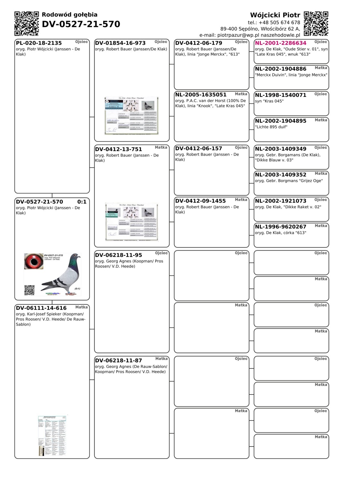 oryg. Piotr Wójcicki (Janssen-De Klak) Szczegóły pochodzenia i wyniki lotowe w rodowodzie i załączonych materiałach. Gołębie były lotowane w oddziałach PZHGP. Więcej informacji o gołębiu pod nr tel.: 501 186 973. Uwaga!!! - zdjęcie gołębia było robione po zakończeniu sezonu lotowego - 2021.