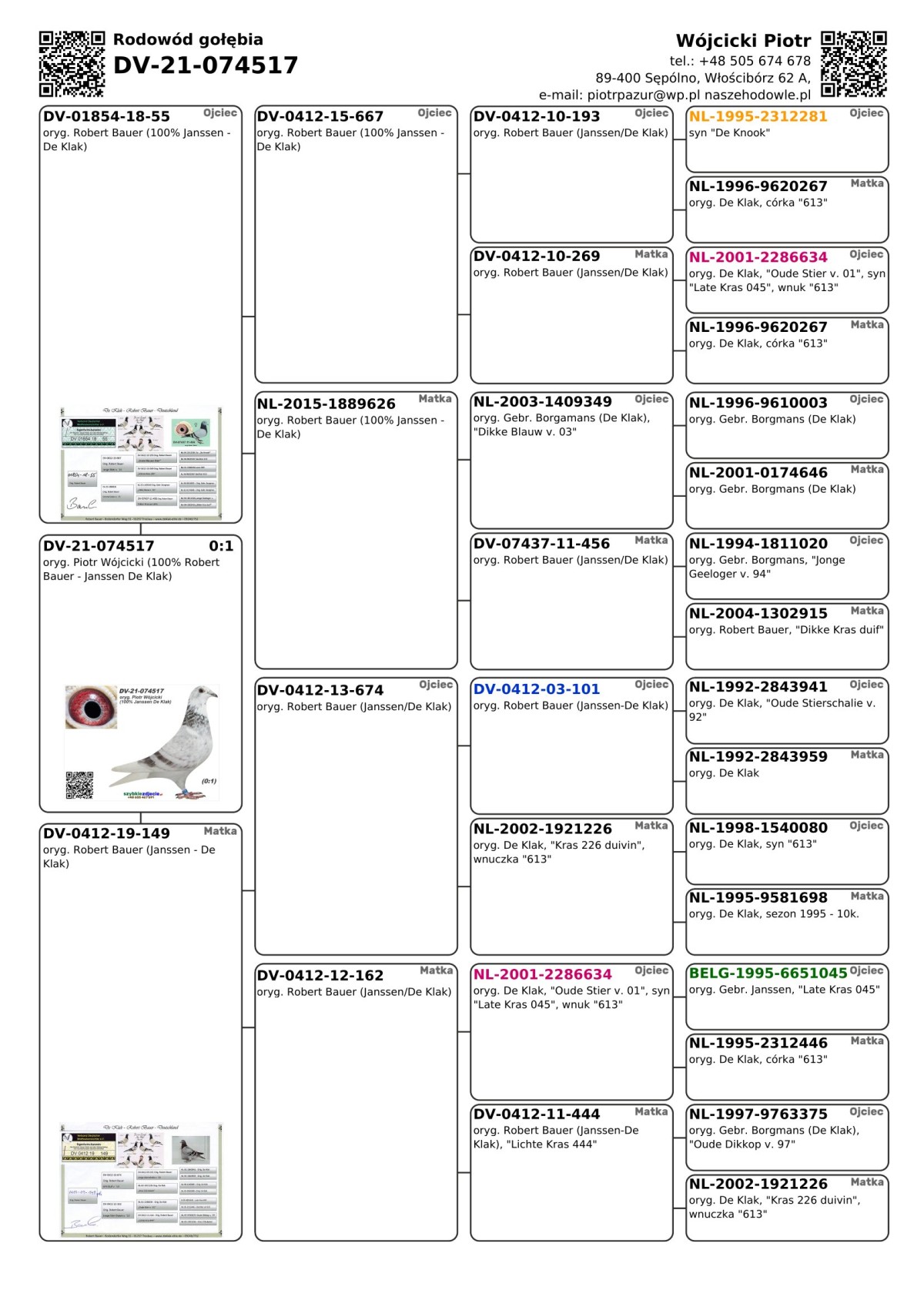 oryg. Piotr Wójcicki (Janssen-De Klak) Szczegóły pochodzenia i wyniki lotowe w rodowodzie i załączonych materiałach. Gołębie były lotowane w oddziałach PZHGP. Więcej informacji o gołębiu pod nr tel.: 501 186 973. Uwaga!!! - zdjęcie gołębia było robione po zakończeniu sezonu lotowego - 2021.