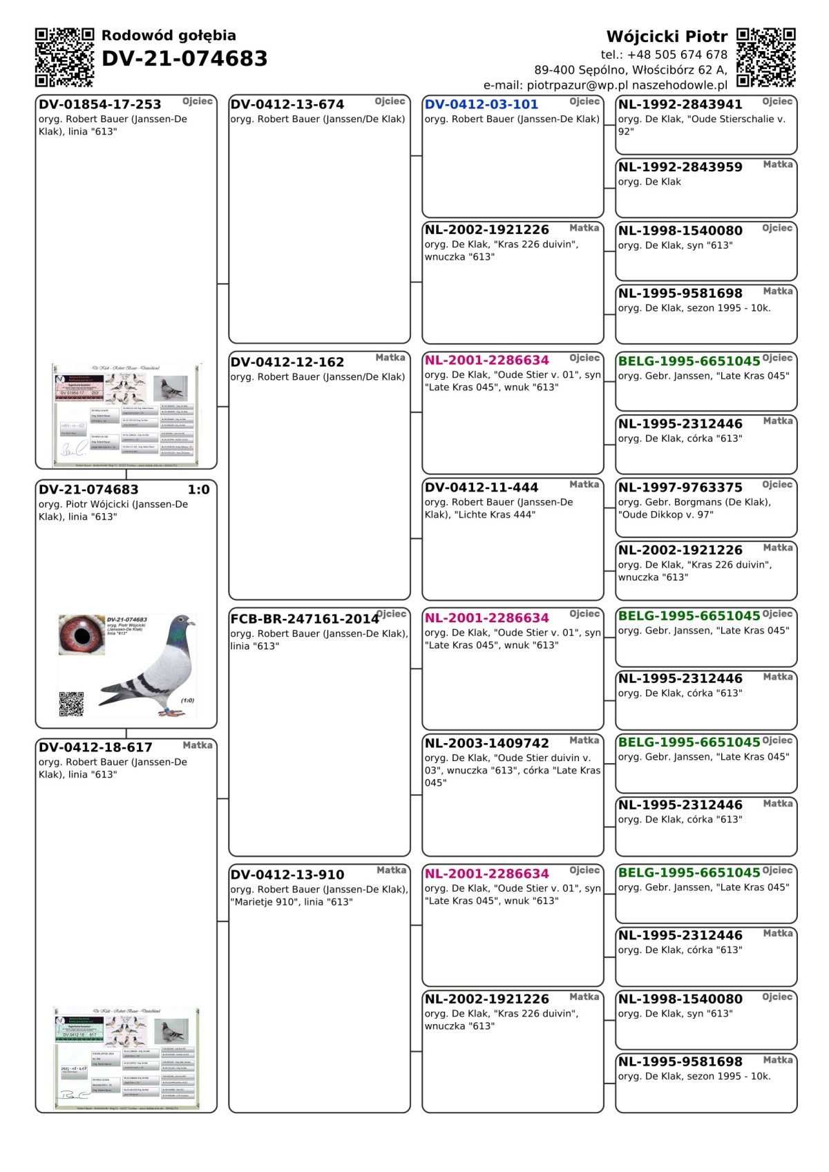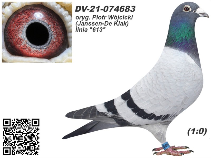 oryg. Piotr Wójcicki (Janssen-De Klak) Szczegóły pochodzenia i wyniki lotowe w rodowodzie i załączonych materiałach. Gołębie były lotowane w oddziałach PZHGP. Więcej informacji o gołębiu pod nr tel.: 501 186 973. Uwaga!!! - zdjęcie gołębia było robione po zakończeniu sezonu lotowego - 2021.