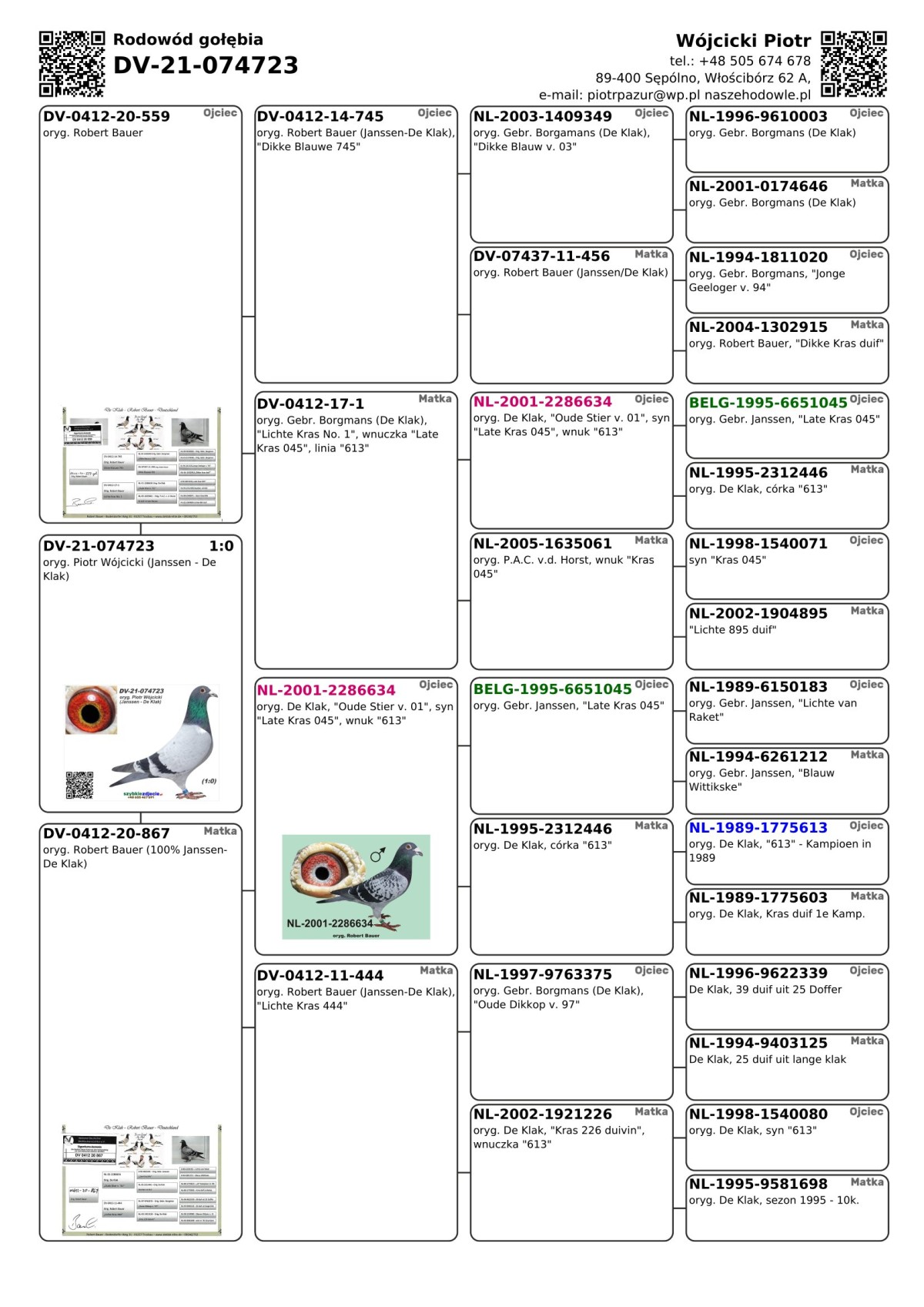 oryg. Piotr Wójcicki (Janssen-De Klak) Szczegóły pochodzenia i wyniki lotowe w rodowodzie i załączonych materiałach. Gołębie były lotowane w oddziałach PZHGP. Więcej informacji o gołębiu pod nr tel.: 501 186 973. Uwaga!!! - zdjęcie gołębia było robione po zakończeniu sezonu lotowego - 2021.