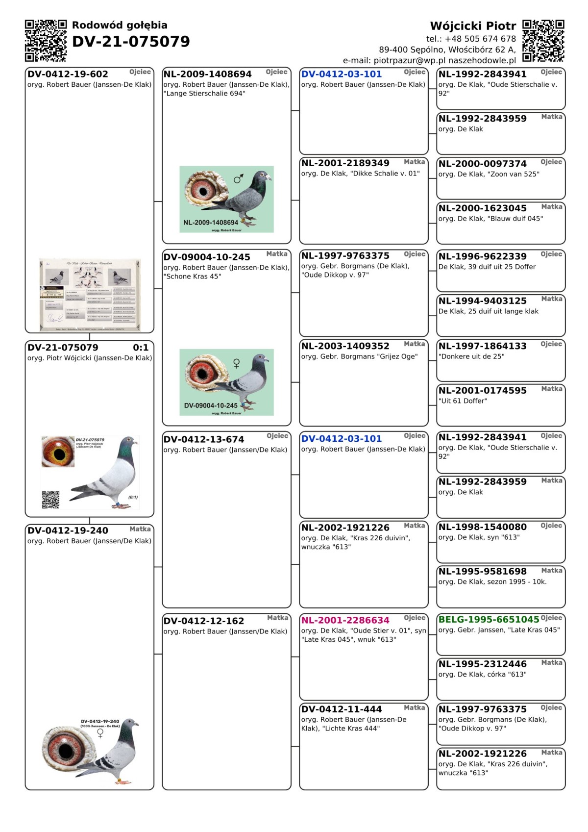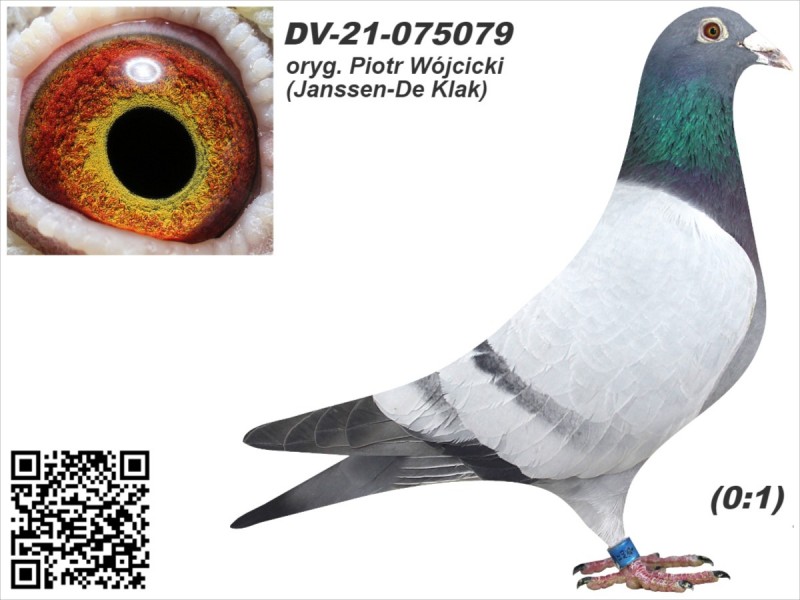 oryg. Piotr Wójcicki (Janssen - De Klak) Szczegóły pochodzenia i wyniki lotowe w rodowodzie i załączonych materiałach. Gołębie były lotowane w oddziałach PZHGP. Więcej informacji o gołębiu pod nr tel.: 501 186 973. Uwaga!!! - zdjęcie gołębia było robione po zakończeniu sezonu lotowego - 2021.