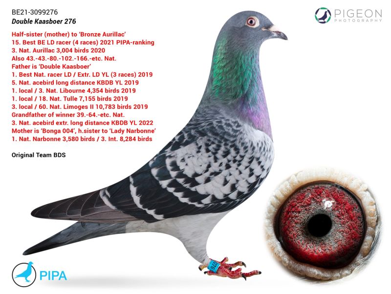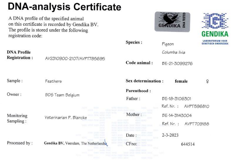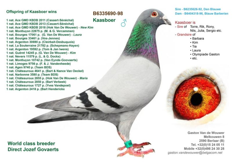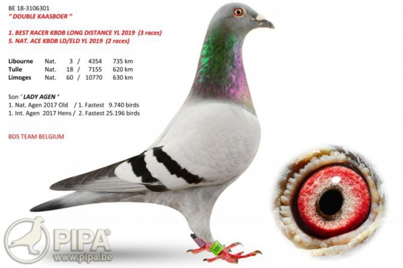 Córka DOUBLE KAASBOER- najlepszego roczniaka Belgii w lotach dalekich. DOUBLE KAASBOER (na filmie) sprzedany na PIPA za 144 tys. euro (ponad 600 tys. zł). Wnuczka LADY AGEN- 1 konkurs z Agen na 9.740 goł. Młody po dwóch wnukach DOUBLE KAASBOER wygrał lot finałowy na WG. Szczegóły pochodzenia w rodowodzie i pod nr tel. 696 241 555