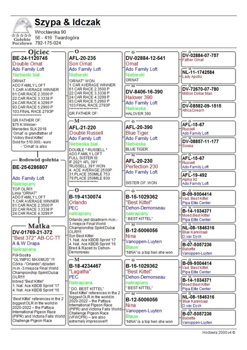 Profesjonalna hodowla z wieloletnim doświadczeniem, posiadająca w swoim stadzie materiał najwyższej światowej klasy. Więcej informacji w załączonych materiałach oraz pod nr tel. 792-175-024.Wysyłka 100 zł UWAGA -Transport gołębi odbędzie się między 16-Luty .a 18-Luty 2026 WSZYSTKIE GOŁĘBIE BĘDĄ PO KURACJACH-GOTOWE DO ŁĄCZENIA W PARY