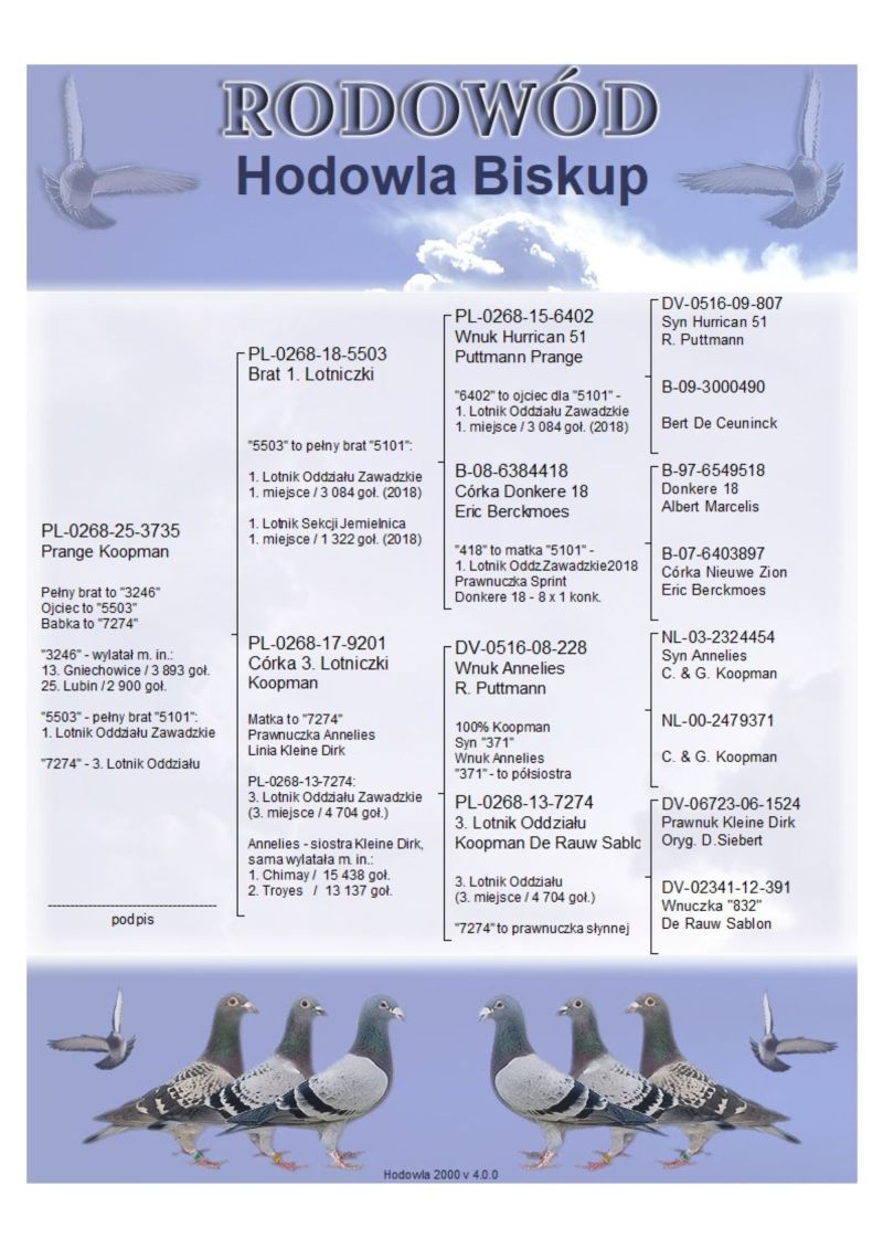 Pełny brat to "3246"; Ojciec to "5503"; Babka to "7274"; "3246" - wylatał m. in.: 13. Gniechowice / 3 893 goł., 25. Lubin / 2 900 goł.; "5503" - pełny brat "5101": 1. Lotnik Oddziału Zawadzkie; "7274" - 3. Lotnik Oddziału; /// Koszt wysyłki 150 zł ///