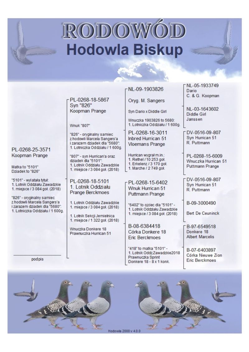 Matka to "5101"; Dziadek to "826"; "5101" - wylatała tytuł: 1. Lotnik Oddziału Zawadzkie, 1. miejsce / 3 084 goł. (2018); "826" - oryginalny samiec z hodowli Marcela Sangers'a
