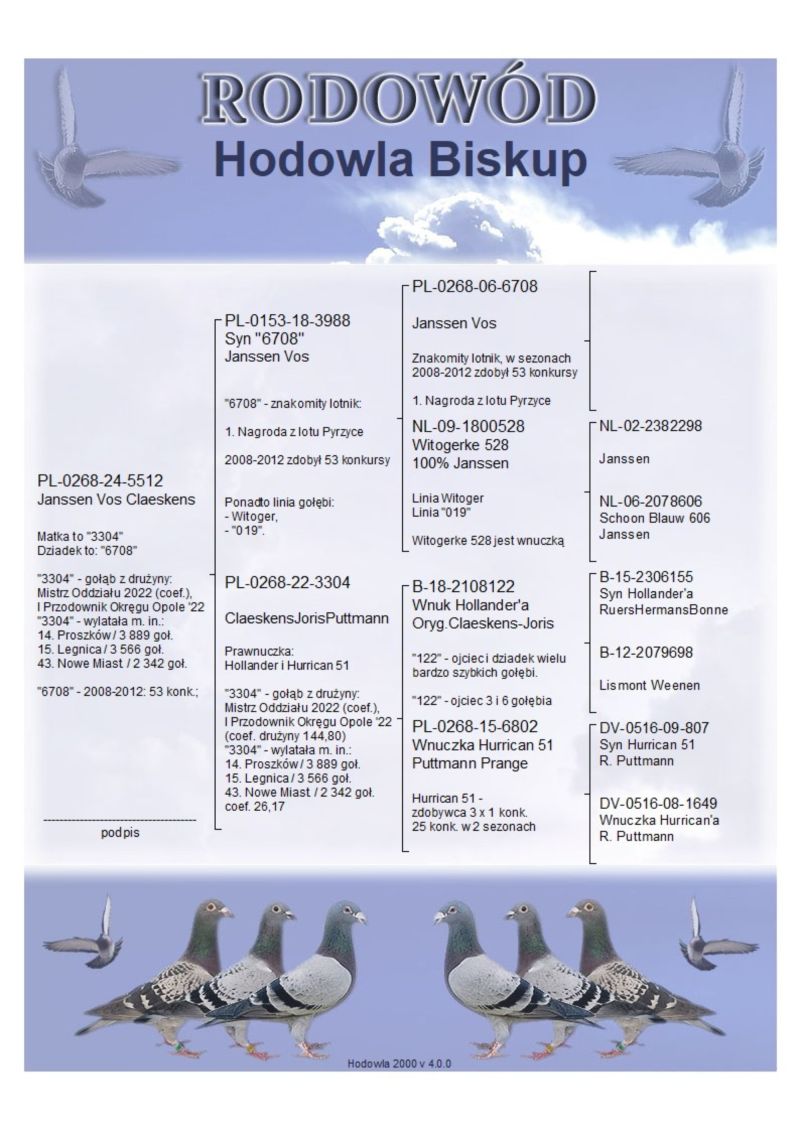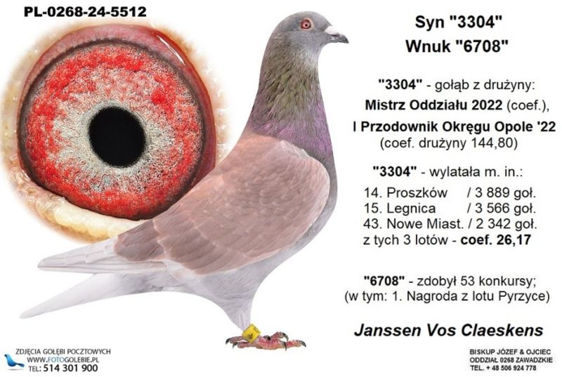 Matka to "3304"; Dziadek to: "6708"; "3304" - gołąb z drużyny: Mistrz Oddziału 2022 (coef.), I Przodownik Okręgu Opole '22; "3304" - wylatała m. in.: 14. Proszków / 3 889 goł., 15. Legnica / 3 566 goł., 43. Nowe Miast. / 2 342 goł.; "6708" - 2008-2012: 53 konk.; /// Koszt wysyłki 150 zł ///