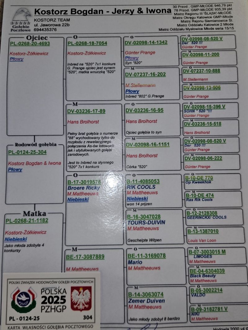Rodzeństwo tego gołębia bardzo dobrze spisuje się w naszej hodowli. Gołębie lotowane są na dystansach od 100-800km. W sezonie 2025 wylatały 28. przodownika Polski w kat.B. Więcej wyników dostępne na stronie Oddziału Katowice.