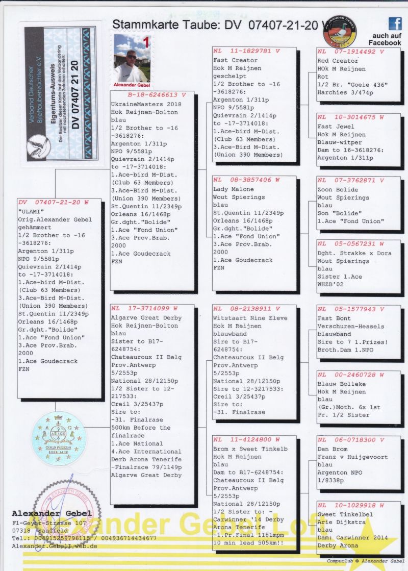 ***** UWAGA ***** !!!!! Możliwy odbiór osobisty lub dostawa realizowana przez kuriera w cenie od 100 do 160 zł. (w zależności od kuriera) !!!!! Oryginalny gołąb z hodowli Alexander Gebel. Szczegóły pochodzenia w rodowodzie. Gołąb gotowy do sezonu lęgowego, zaszczepiony przeciwko paramyksowirozie (Columba) i salmonellozie (Salmo PT). Więcej informacji pod nr tel.: 669 404 144. Wpłata za gołębia na konto po zakończeniu aukcji. Możliwy odbiór osobisty lub dostawa realizowana przez kuriera w cenie od 100 do 160 zł. (w zależności od kuriera) *** ZAPRASZAMY RÓWNIEŻ NA INNE NASZE AUKCJE ***