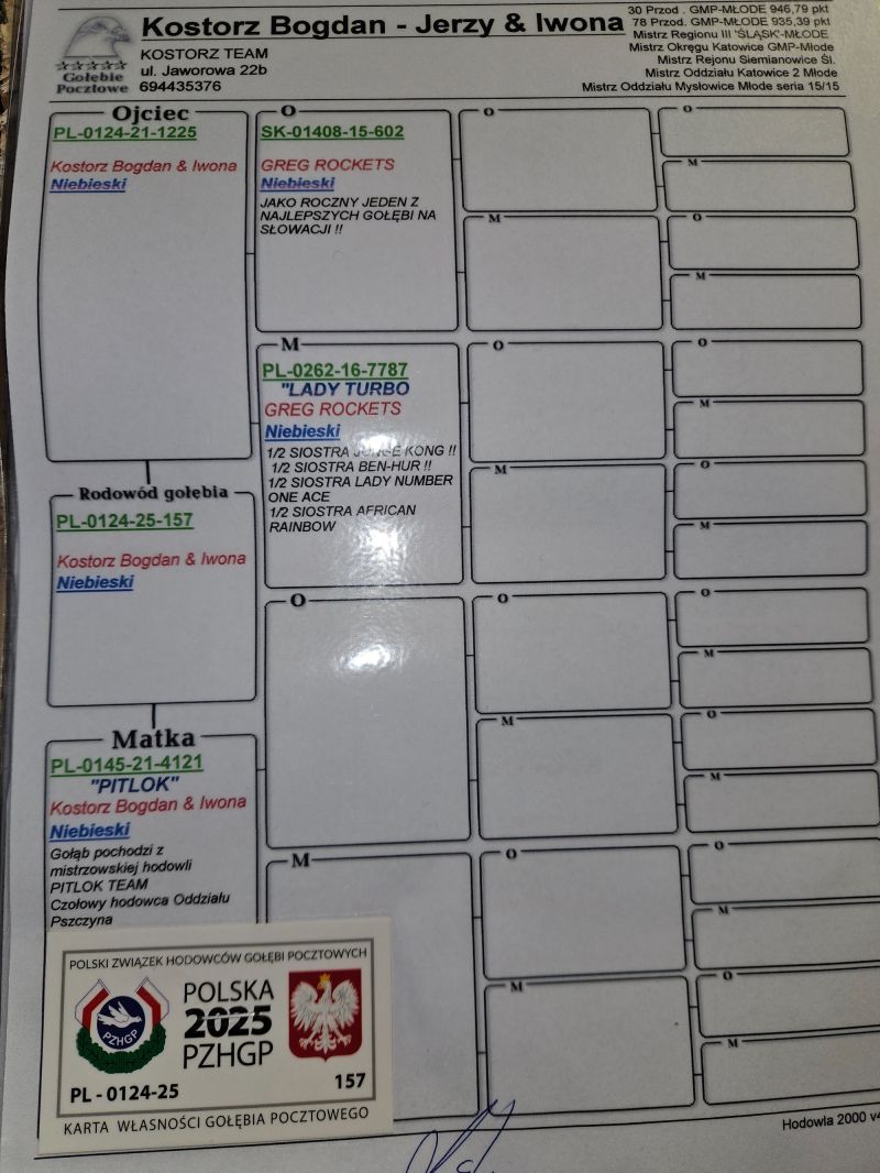 Rodzeństwo tego gołębia bardzo dobrze spisuje się w naszej hodowli. Gołębie lotowane są na dystansach od 100-800km. W sezonie 2025 wylatały 28. przodownika Polski w kat.B. Więcej wyników dostępne na stronie Oddziału Katowice.