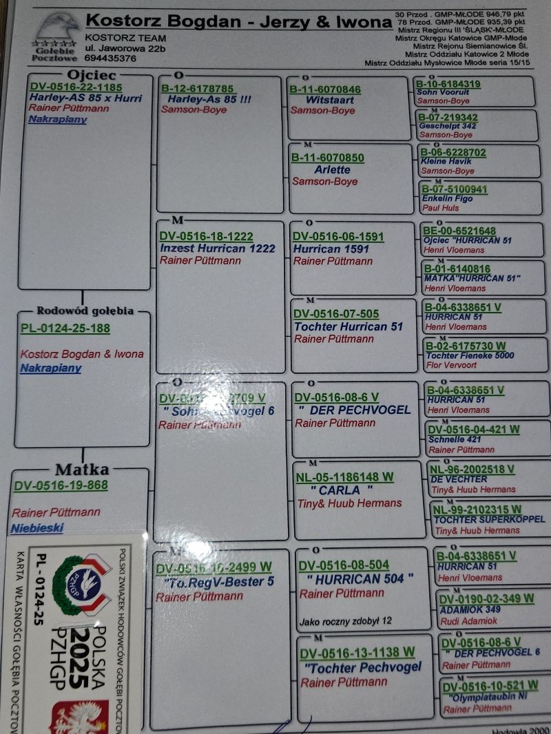 Rodzeństwo tego gołębia bardzo dobrze spisuje się w naszej hodowli. Gołębie lotowane są na dystansach od 100-800km. W sezonie 2025 wylatały 28. przodownika Polski w kat.B. Więcej wyników dostępne na stronie Oddziału Katowice.